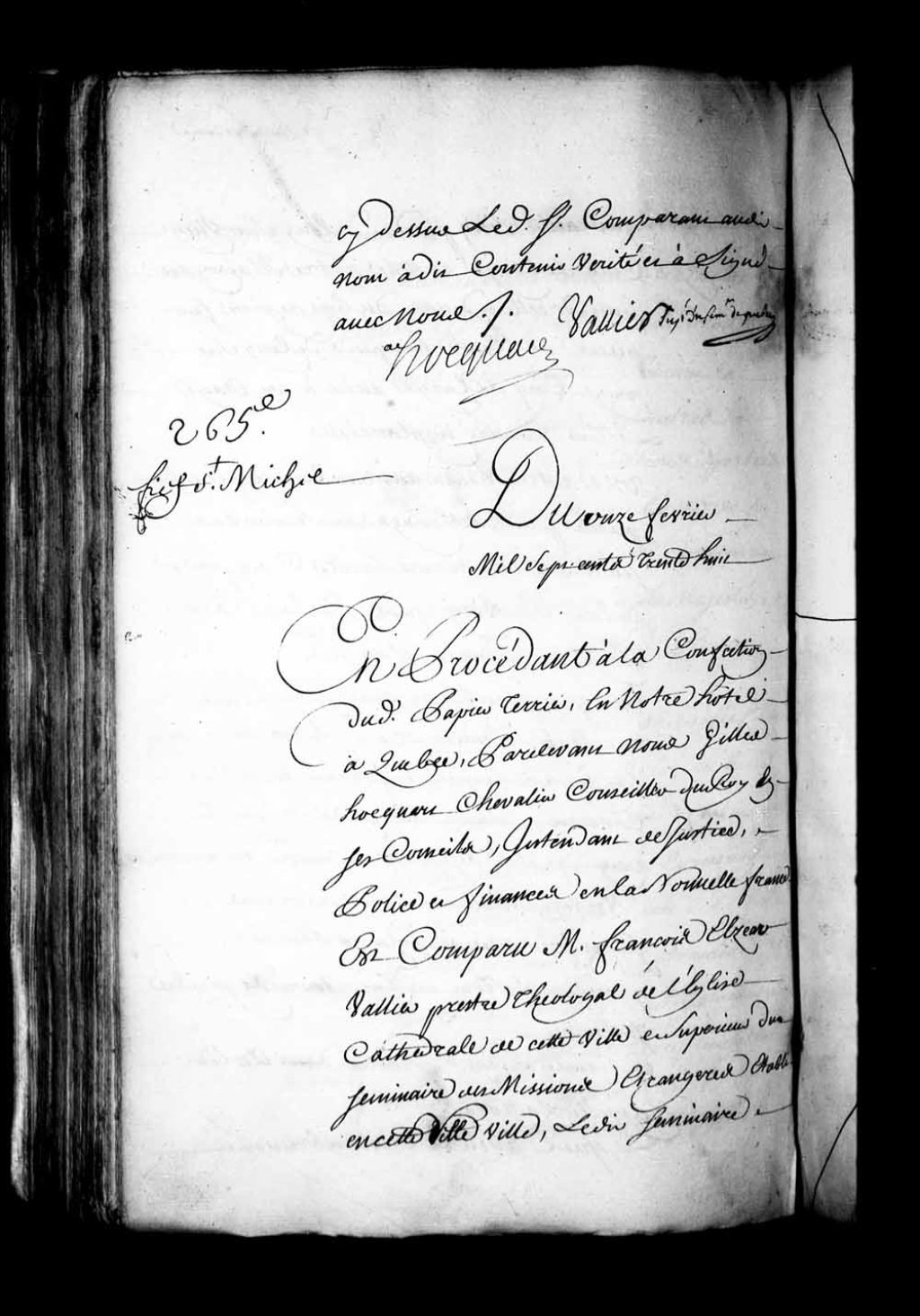 Aveu et dénombrement de messire François-Elzéar Vallier, prêtre théologal de l'église cathédrale de Québec et supérieur du Séminaire des Missions-Étrangères de ladite ville de Québec, pour le fief de Saint-Michel, 11 février 1738, Archives nationales à Québec, Fonds Intendants, (03Q,E1,S4,SS3,P265).