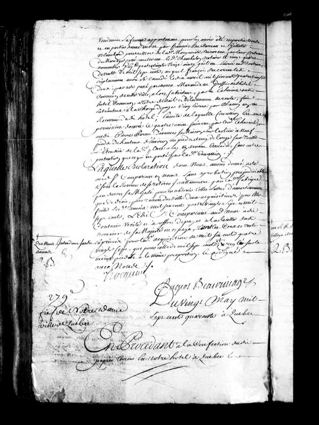 - Aveu et dénombrement de Gilles Rageot, marguillier en charge de l'oeuvre et fabrique de l'église paroissiale de Notre-Dame de Québec, pour le fief de Notre-Dame-de-Québec, lequel fief appartenant à ladite oeuvre et fabrique Notre-Dame