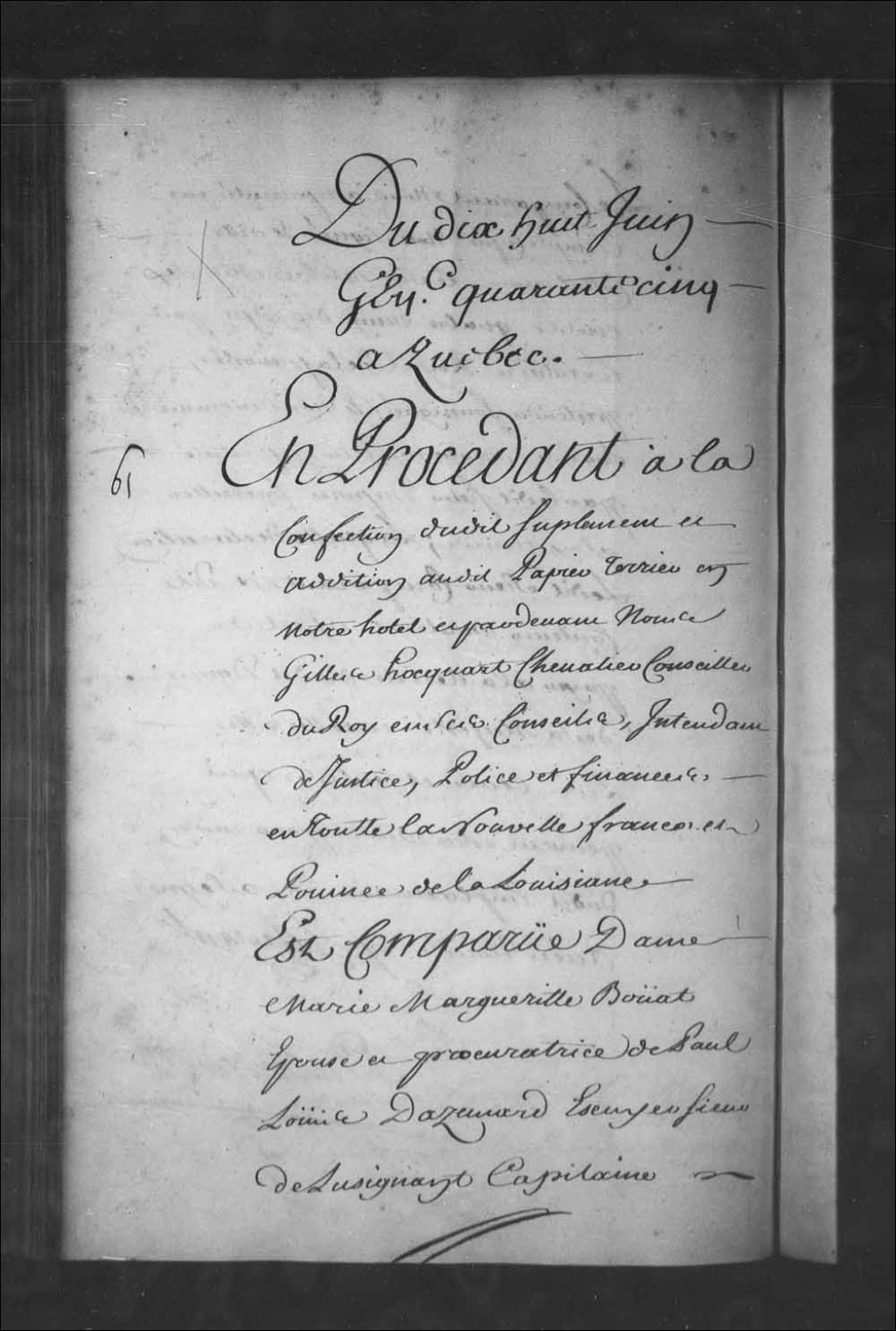 - Déclaration de dame Marie-Marguerite Bouat, épouse et procuratrice de Paul-Louis Dazemard (Dazemar), écuyer, sieur de Lusignan, capitaine dans les troupes du détachement de la Marine et commandant pour le Roi au poste de la baie des Sakis, quant à un emplacement qu'il détient en la censive du Domaine du Roi, lequel emplacement étant sis rue Notre-Dame en la Basse-Ville de Québec
