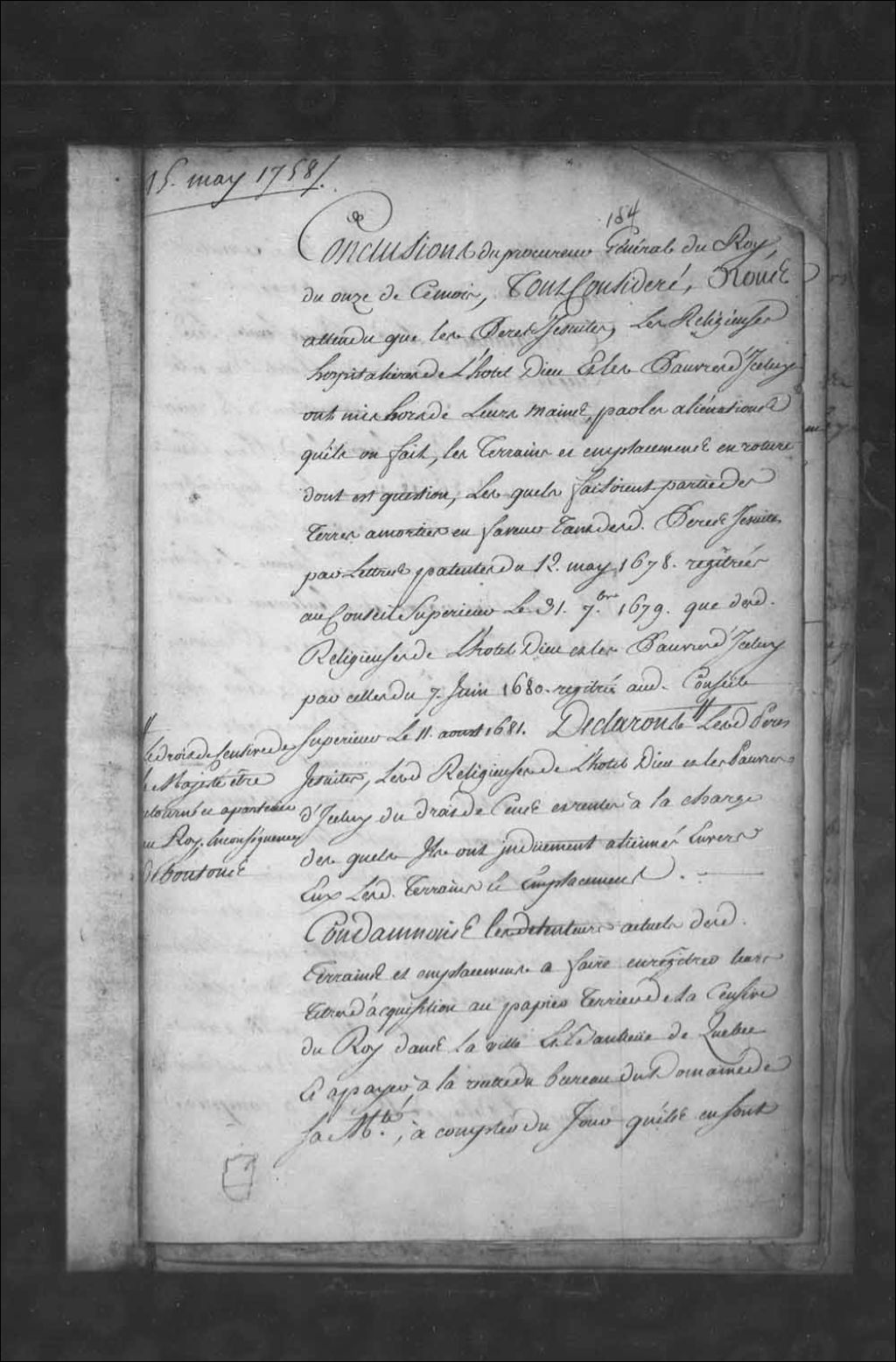 Jugement contre les Pères Jésuites, les religieuses de l'Hôtel-Dieu de Québec et les Pauvres pour des droits seigneuriaux, 15 mai 1758, Archives nationales à Québec, Fonds Intendants, (03Q,E1,S4,SS3,P356).