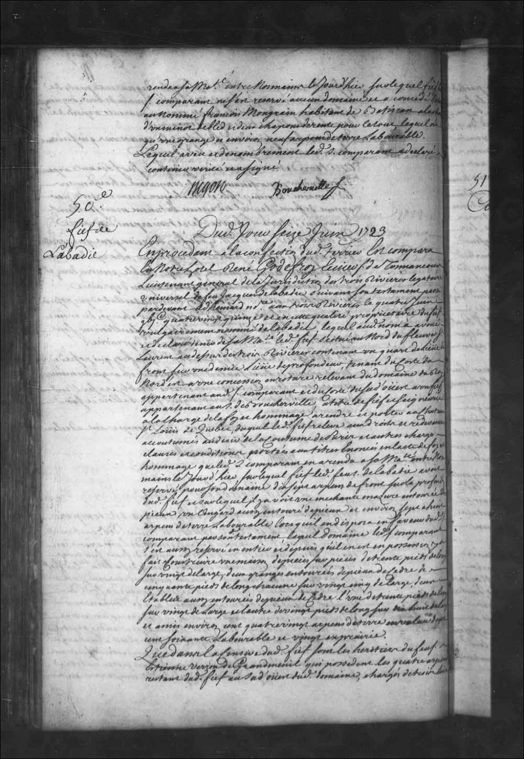 Aveu et dénombrement de René Godefroy, écuyer, sieur de Tonnancour, lieutenant général de la juridiction des Trois-Rivières, légataire universel de Jacques Labadie, pour le fief vulgairement nommé de Labadie, 16 juin 1723, Archives nationales à Québec, Fonds Intendants, (03Q,E1,S4,SS3,P50).