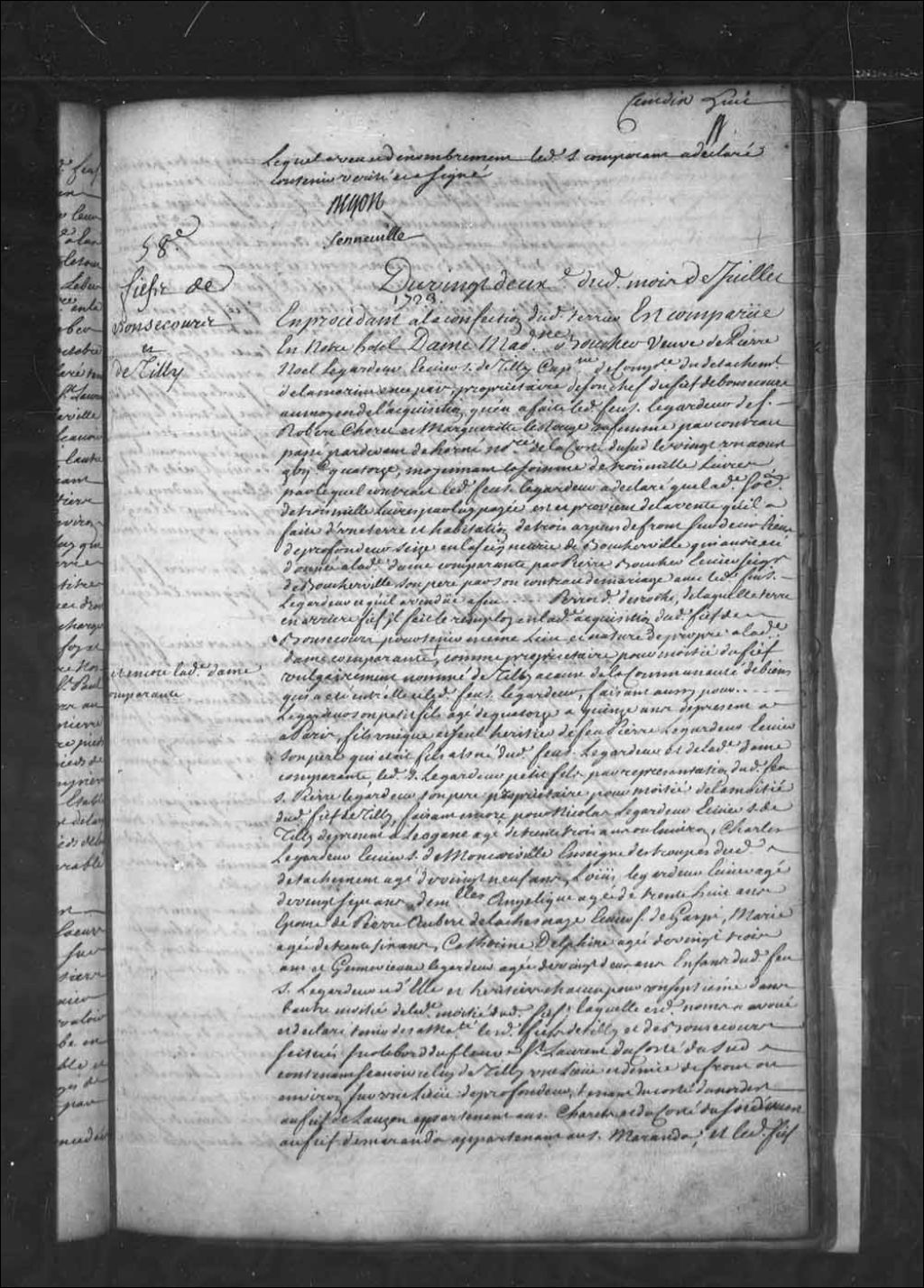 Aveu et dénombrement de Madeleine Boucher, veuve de feu Pierre-Noël Le Gardeur (Legardeur), écuyer, sieur de Tilly, capitaine dans les troupes du détachement de la Marine en Nouvelle-France, pour le fief vulgairement nommé de Tilly, 22 juillet 1723, Archives nationales à Québec, Fonds Intendants, (03Q,E1,S4,SS3,P58).