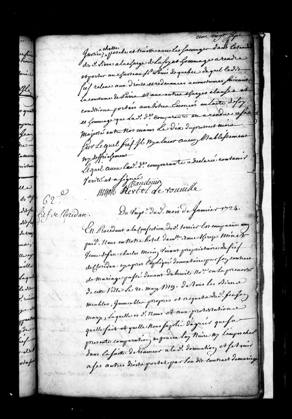 Aveu et dénombrement de damoiselle Anne-Thérèse Minet, veuve de feu Charles Morin, pour le fief de Cloridan, 20 janvier 1724, Archives nationales à Québec, Fonds Intendants, (03Q,E1,S4,SS3,P62).