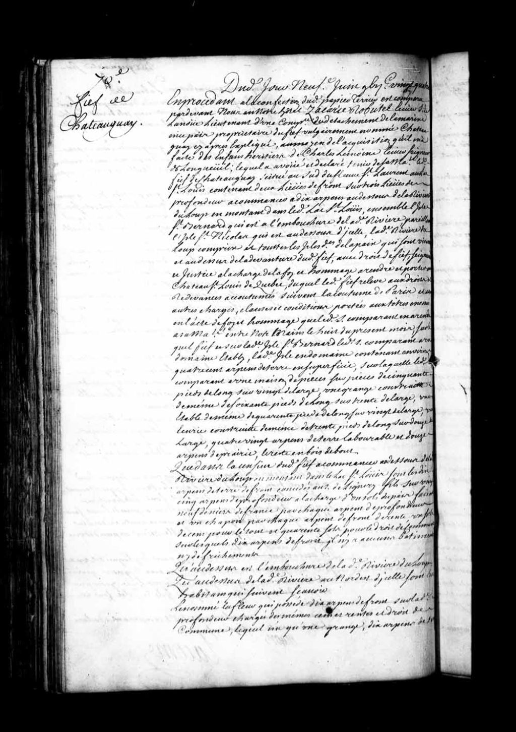 Aveu et dénombrement de Zacharie Robutel, écuyer, sieur de Lanoue (La Noue), lieutenant d'une compagnie du détachement de la Marine en Nouvelle-France, pour le fief vulgairement appelé Châteauguay, 9 juin 1724, Archives nationales à Québec, Fonds Intendants, (03Q,E1,S4,SS3,P70).