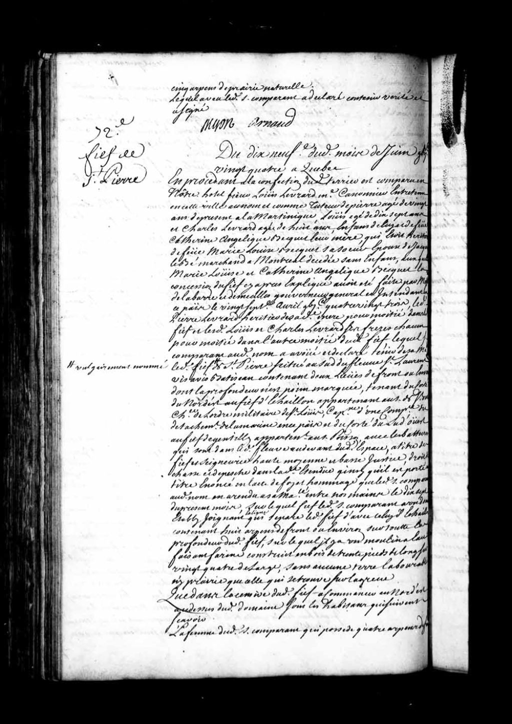 Aveu et dénombrement du sieur Louis Levrard, maître canonnier, au nom et comme tuteur des enfants mineurs issus de son mariage avec feu Catherine-Angélique Becquet, pour le fief de Saint-Pierre, 19 juin 1724, Archives nationales à Québec, Fonds Intendants, (03Q,E1,S4,SS3,P72).