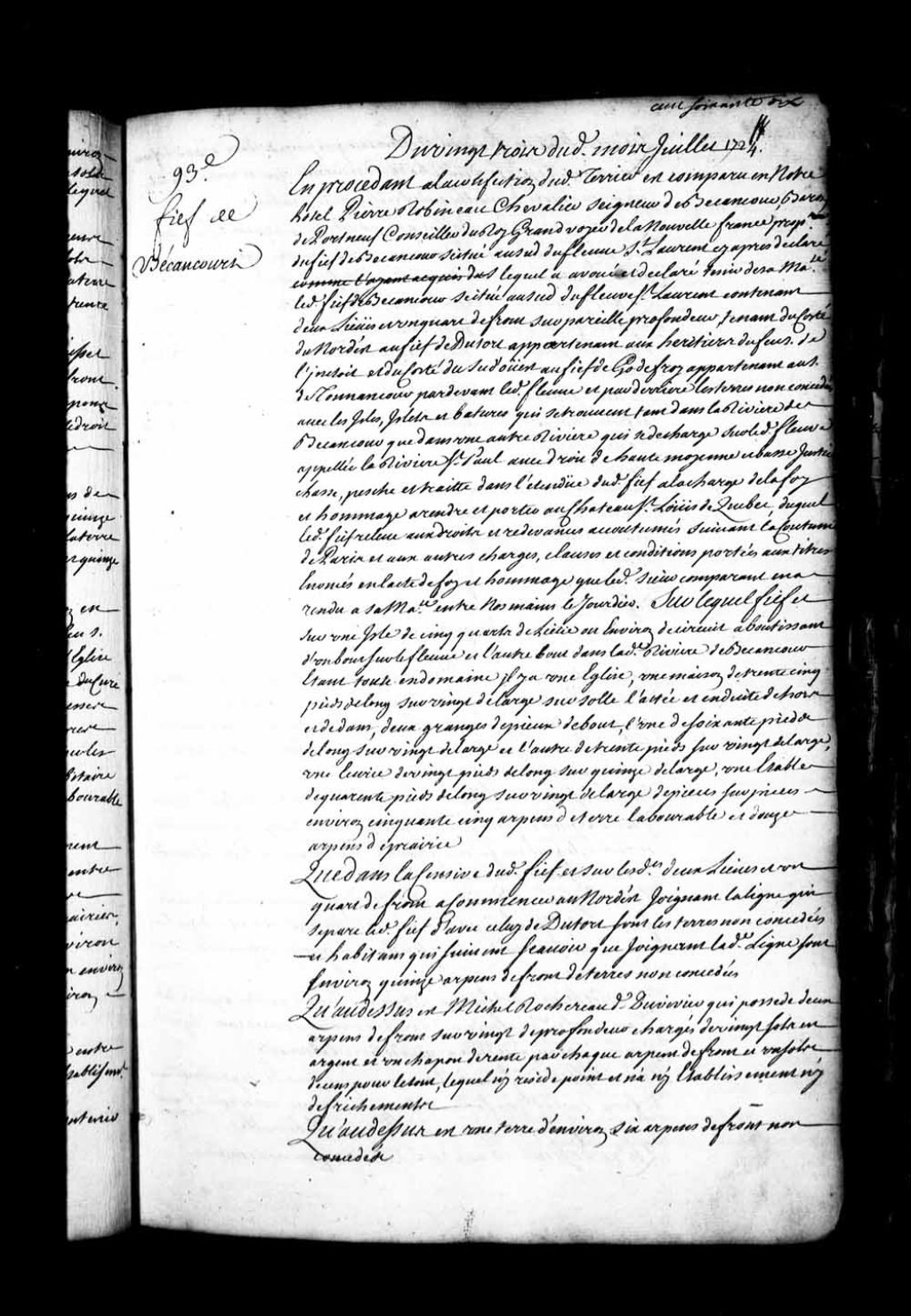 Aveu et dénombrement de Pierre Robineau, chevalier, seigneur de Bécancour, baron de Portneuf et grand voyer de la Nouvelle-France, pour le fief de Bécancour situé au sud du fleuve Saint-Laurent, 23 juillet 1724, Archives nationales à Québec, Fonds Intendants, (03Q,E1,S4,SS3,P93).