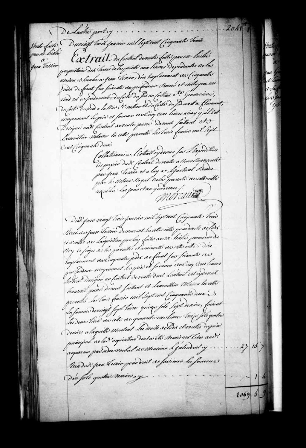 Extrait du contrat de vente par Monsieur Hiché, propriétaire des terres de la Pointe aux Lièvres, dépendantes de la Maison Blanche, à Jean Tessier d'un emplacement sis à Québec, borné par la rue Saint-Vallier (Notaires Paul-Antoine-François Lanouiller Desgranges et Jean-Antoine Saillant de Collégien)