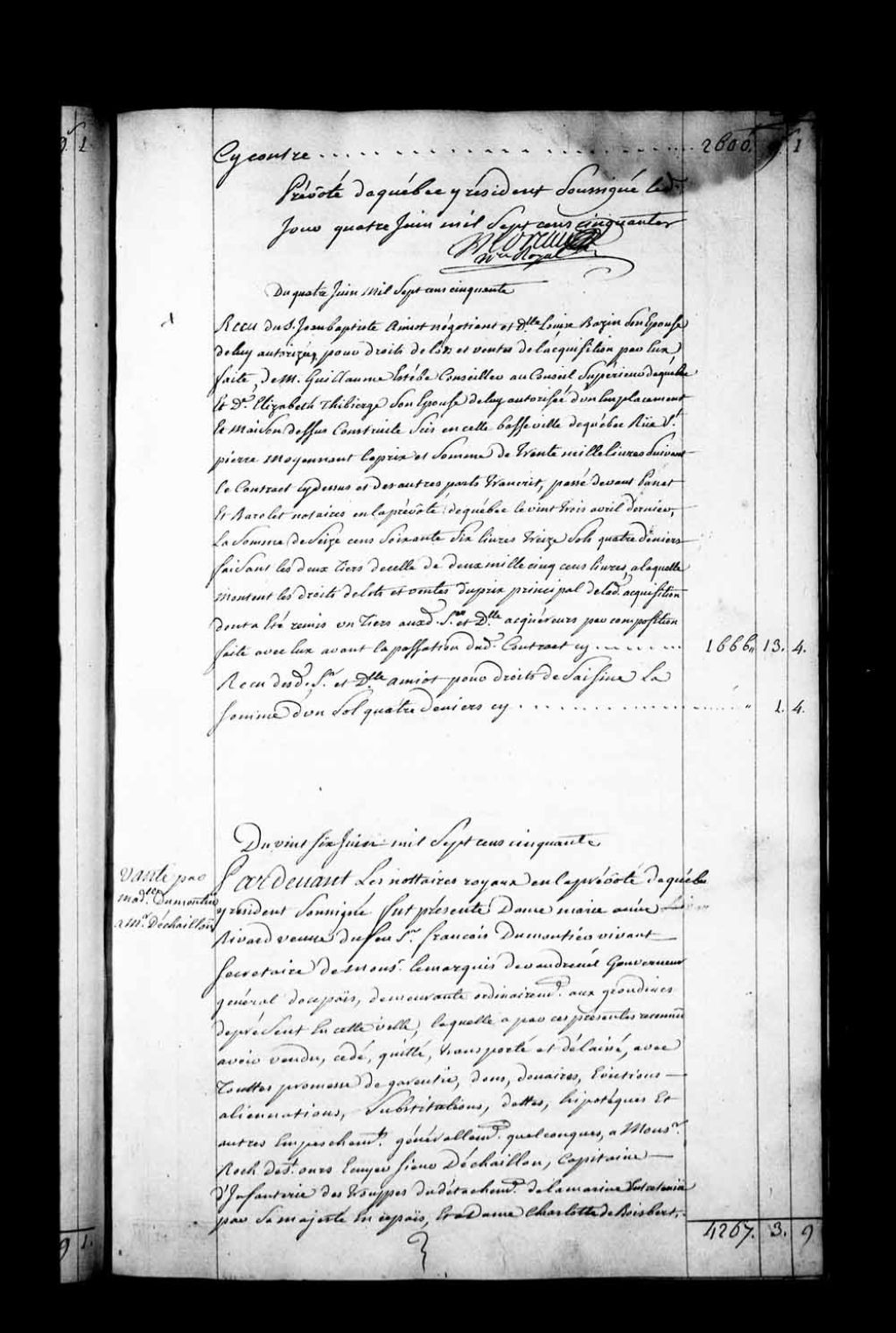 Contrat de vente par Dame Marie-Anne Rivard, demeurant aux Grondines, veuve du feu Sieur François Dumontier, de son vivant secrétaire de Monsieur le Marquis de Vaudreuil, Gouverneur général de la Nouvelle-France, à Monsieur Roch de Saint-Ours, écuyer, Sieur Déchaillon (Deschaillons), capitaine d'infanterie des troupes du détachement de la Marine entretenues par Sa Majesté en Nouvelle-France, et Dame Charlotte de Boisbert (Boishébert), son épouse, demeurant rue Buade à Québec, d'un emplacement et d'une vieille maison de pierre et colombage sis rue Saint-Louis en la Haute-Ville de Québec (Notaires Jean-Antoine Saillant de Collégien et Paul-Antoine-François Lanouiller Desgranges)