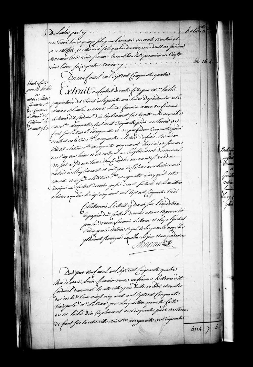 Extrait du contrat de vente par Monsieur Hiché, propriétaire des terres de la Pointe aux Lièvres, dépendantes de la Maison Blanche, à Marie-Louise Fournier, veuve de François LeRoux dit Cardinal, d'un emplacement sis rue Sainte-Marguerite à Québec (Notaires Paul-Antoine-François Lanouiller Desgranges et Jean-Antoine Saillant de Collégien)