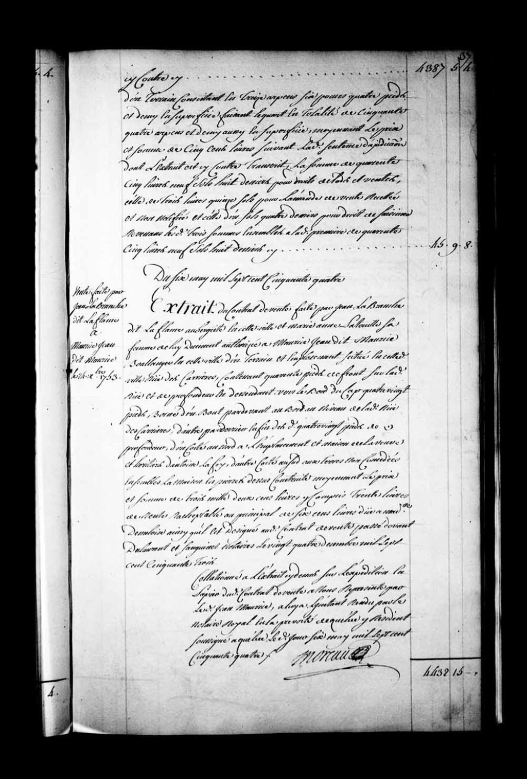 Extrait du contrat de vente par Jean LaBranche dit Laflame (Laflamme), aubergiste de Québec, et Marie-Anne Patouille (Patoile), sa femme, à Maurice Jean dit Maurice, boulanger de Québec, d'un emplacement et d'une maison de pierre sis rue des Carrières à Québec (Notaires Christophe-Hilarion Dulaurent et Simon Sanguinet père)