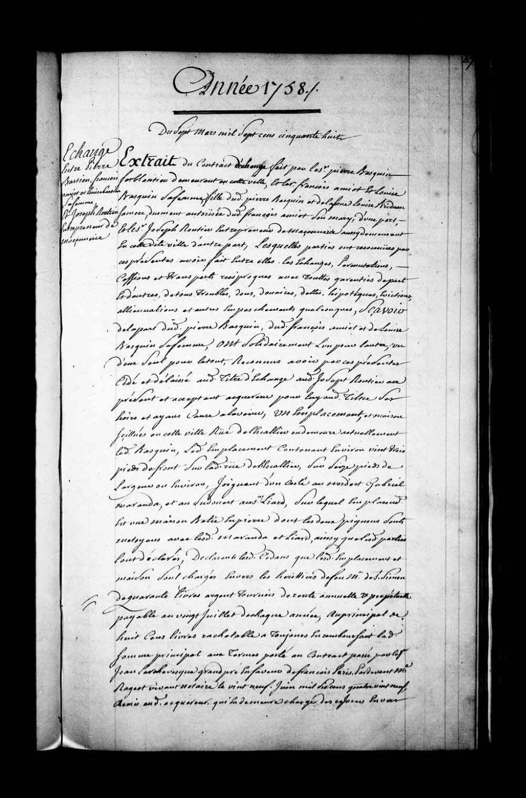Extrait d'un contrat d'échange entre le Sieur Pierre Basquin (Bastien), ferblantier demeurant à Québec, le Sieur François Amiot et Louise Basquin, sa femme, fille dudit Pierre Basquin et de feue Louise Brideau, sa mère, d'une part, et le Sieur Joseph Routier (Routhier), entrepreneur de maçonnerie demeurant à Québec, d'autre part, d'un emplacement et d'une maison de pierre sis rue de l'Escalier à Québec en retour d'un emplacement, d'une maison de pierre et d'une écurie sis rue sur le Rempart à Québec, respectivement (Notaire Gilbert Boucault de Godefus), 7 décembre 1750, Archives nationales à Québec, Fonds Intendants, (03Q,E1,S4,SS4,D155,P1).