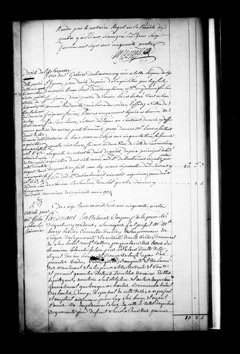 Contrat de vente par Maître Henri Hiché, Conseiller du Roi et Son procureur au siège de la Prévôté et de l'Amirauté de Québec, demeurant rue Saint-Vallier à Québec, propriétaire des terres de la Maison Blanche située près du Palais de Québec, à Charles Boimier (Boesmé; Boismé; Boismier), habitant de Charlesbourg, d'un emplacement sis rue des Prairies à Québec (Notaires Paul-Antoine-François Lanouiller Desgranges et Simon Sanguinet père)
