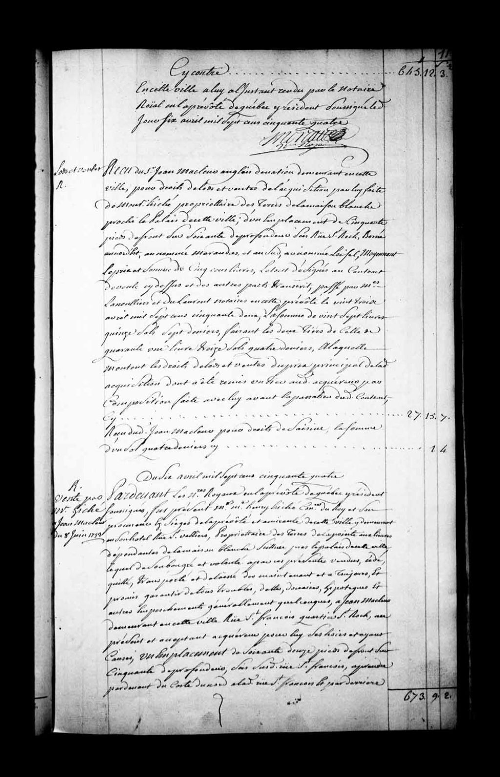 Contrat de vente par Maître Henri Hiché, Conseiller du Roi et Son procureur au siège de la Prévôté et de l'Amirauté de Québec, demeurant rue Saint-Vallier à Québec, propriétaire des terres de la Pointe aux Lièvres, dépendantes de la Maison Blanche située près du Palais de Québec, à Jean Macleur (Maclure), demeurant rue Saint-François au quartier Saint-Roch de Québec, d'un emplacement sis rue Saint-François à Québec (Notaires Paul-Antoine-François Lanouiller Desgranges et Simon Sanguinet père)