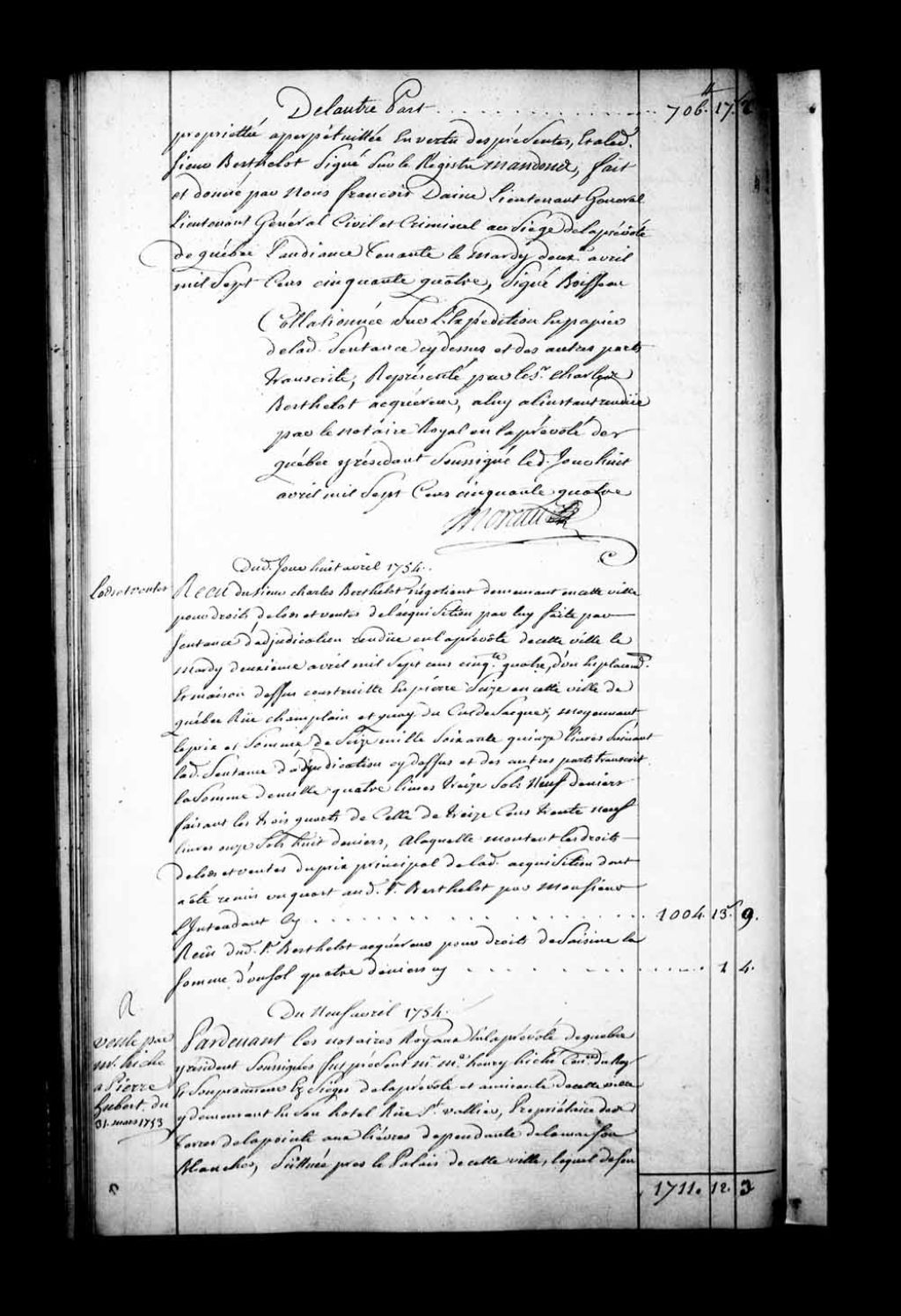 Contrat de vente par Maître Henri Hiché, Conseiller du Roi et Son procureur au siège de la Prévôté et de l'Amirauté de Québec, demeurant rue Saint-Vallier à Québec, propriétaire des terres de la Pointe aux Lièvres, dépendantes de la Maison Blanche située près du Palais de Québec, au Sieur Pierre Hubert et Damoiselle Josèphe Charetier (Chartier), son épouse, laquelle acceptant pour son mari, absent, étant dans les Pays d'en haut pour l'exploitation des bois du Roi, d'un emplacement sis rue Saint-Vallier au faubourg Saint-Henri de Québec (Notaires Paul-Antoine-François Lanouiller Desgranges et Jean-Antoine Saillant de Collégien)