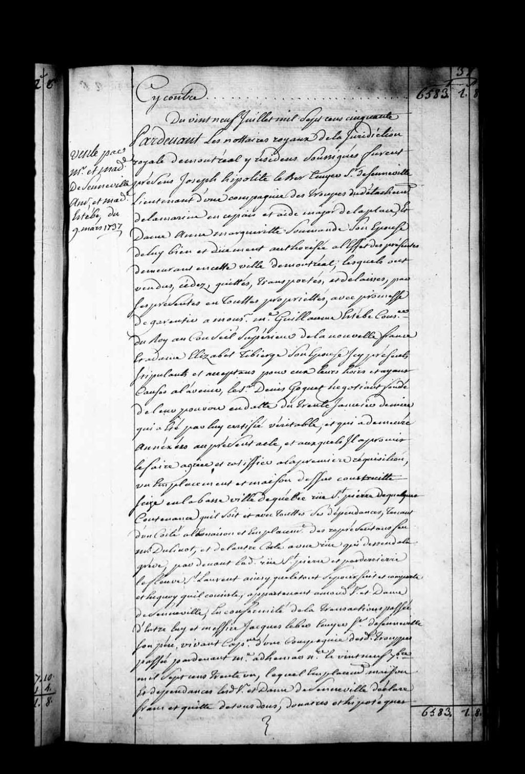 Contrat de vente par Joseph-Hippolyte LeBer, écuyer, Sieur de Senneville, lieutenant d'une compagnie des troupes du détachement de la Marine en Nouvelle-France et aide-major de la place, et Dame Anne-Marguerite Soumande, son épouse, demeurant rue Saint-Paul à Montréal, à Maître Guillaume Estebe, Conseiller du Roi au Conseil supérieur de la Nouvelle-France, et Dame Élisabeth Tibierge (Thibierge), son épouse, demeurant rue Saint-Pierre à Québec, lesquels stipulant par le Sieur Denis Goguet, négociant, fondé de leur pouvoir, d'un emplacement et d'une maison sis rue Saint-Pierre en la Basse-Ville de Québec (Notaires François Lepailleur de LaFerté et Antoine Adhémar dit Saint-Martin)