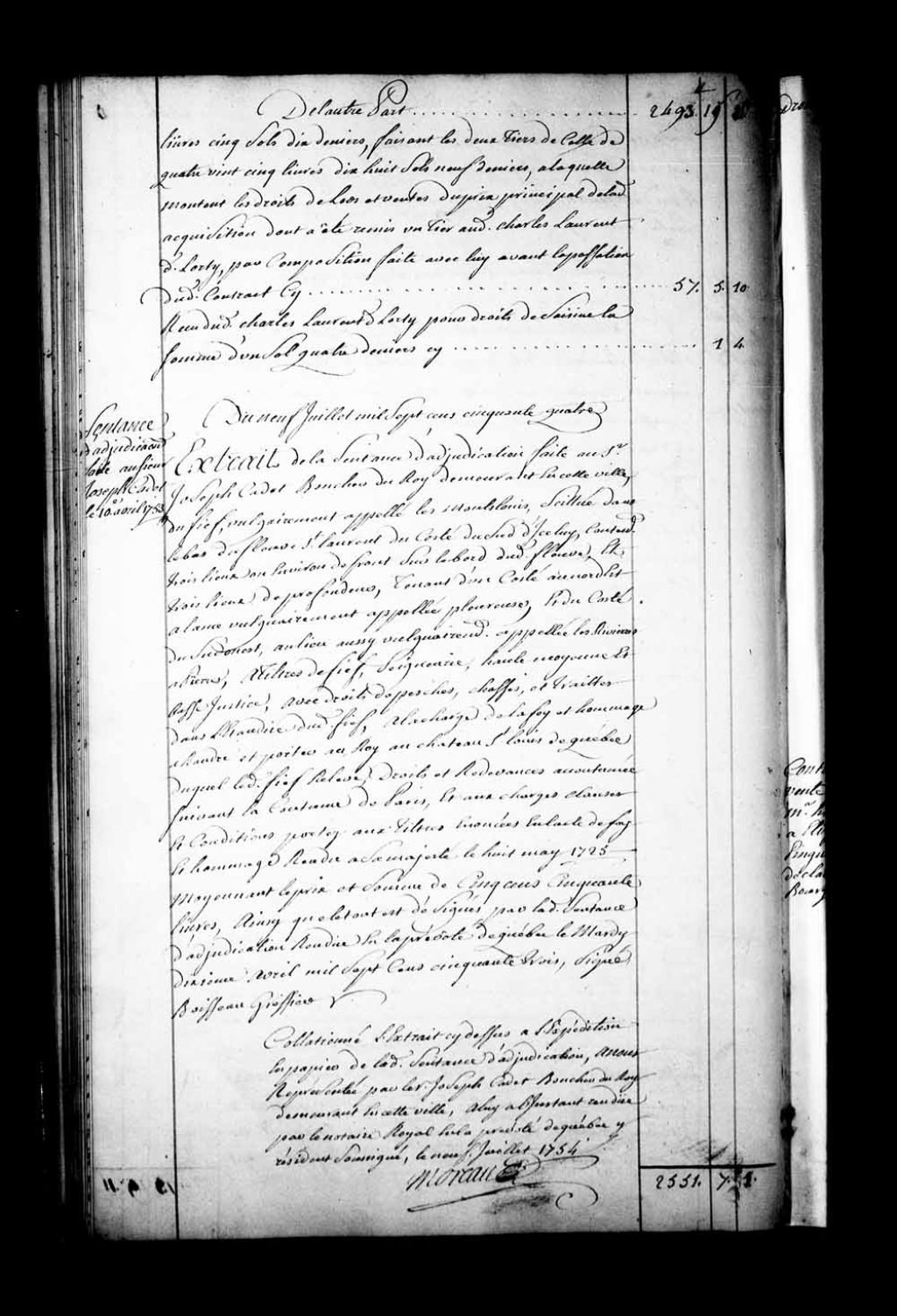 Extrait d'une sentence d'adjudication au Sieur Joseph Cadet, boucher du Roi demeurant à Québec, du fief appelé vulgairement les Monts Louis, sis dans le bas du fleuve Saint-Laurent, du côté sud, entre l'Anse pleureuse et les Rivières à Pierre, à titre de fief et seigneurie