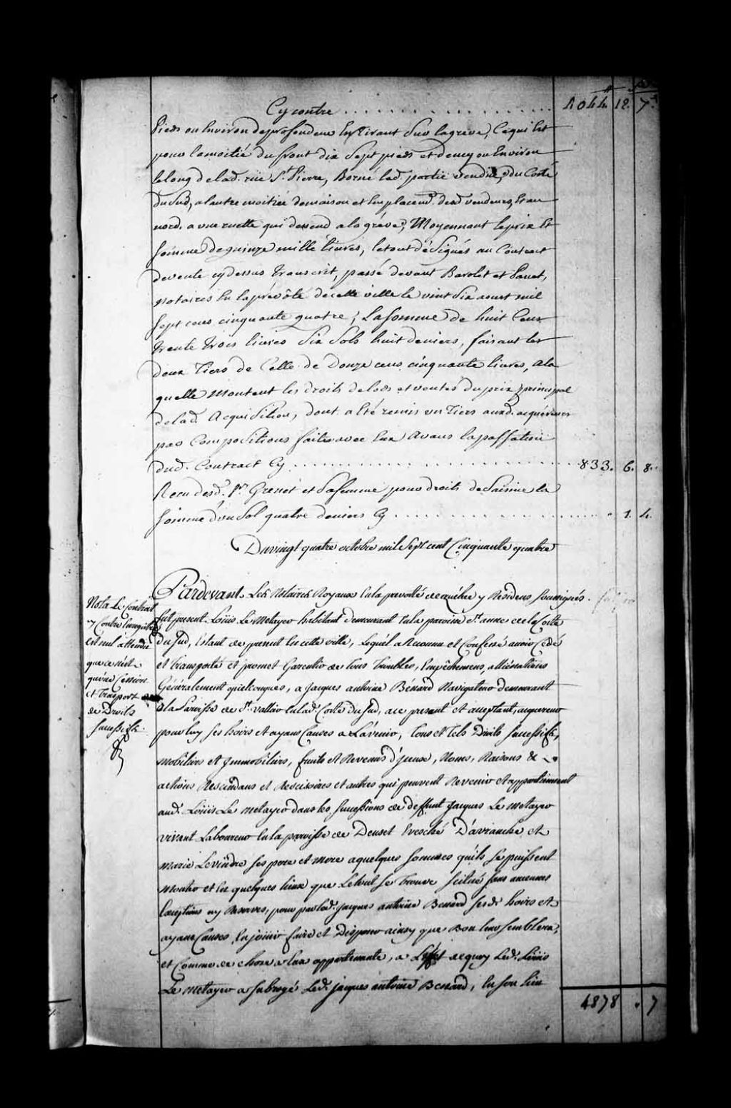 Extrait d'une cession et transport par Louis LeMetayer (Le Métayer), habitant demeurant en la paroisse Sainte-Anne de la côte du Sud, à Jacques-Antoine Bénard (Besnard), navigateur demeurant en la paroisse de Saint-Vallier de la côte du Sud, des droits successifs mobiliers et immobiliers et des fruits et revenus en découlant, lesquels appartenant audit Sieur Louis LeMetayer dans les successions du défunt Jacques LeMetayer, laboureur en la paroisse de Deuset, évêché d'Avranches, et Marie Levindre, ses père et mère (Notaire Simon Sanguinet père), 23 octobre 1754, Archives nationales à Québec, Fonds Intendants, (03Q,E1,S4,SS4,D186,P1).