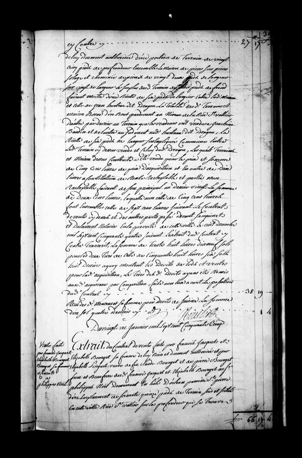 Extrait du contrat de vente par François Jacquets (Jacquet) et Élisabeth Bourget, sa femme, par Élisabeth Pinguet, veuve de feu Claude Bourget, et par Pierre Bourget, frère et beau-frère desdits François Jacquet et Élisabeth Bourget, au Sieur Philippe Noël, demeurant en la paroisse Saint-Pierre de l'île d'Orléans, d'un emplacement et de deux maisons de pièce sur pièce sis rue Saint-Vallier à Québec (Notaires Claude Louet et Christophe-Hilarion Dulaurent)
