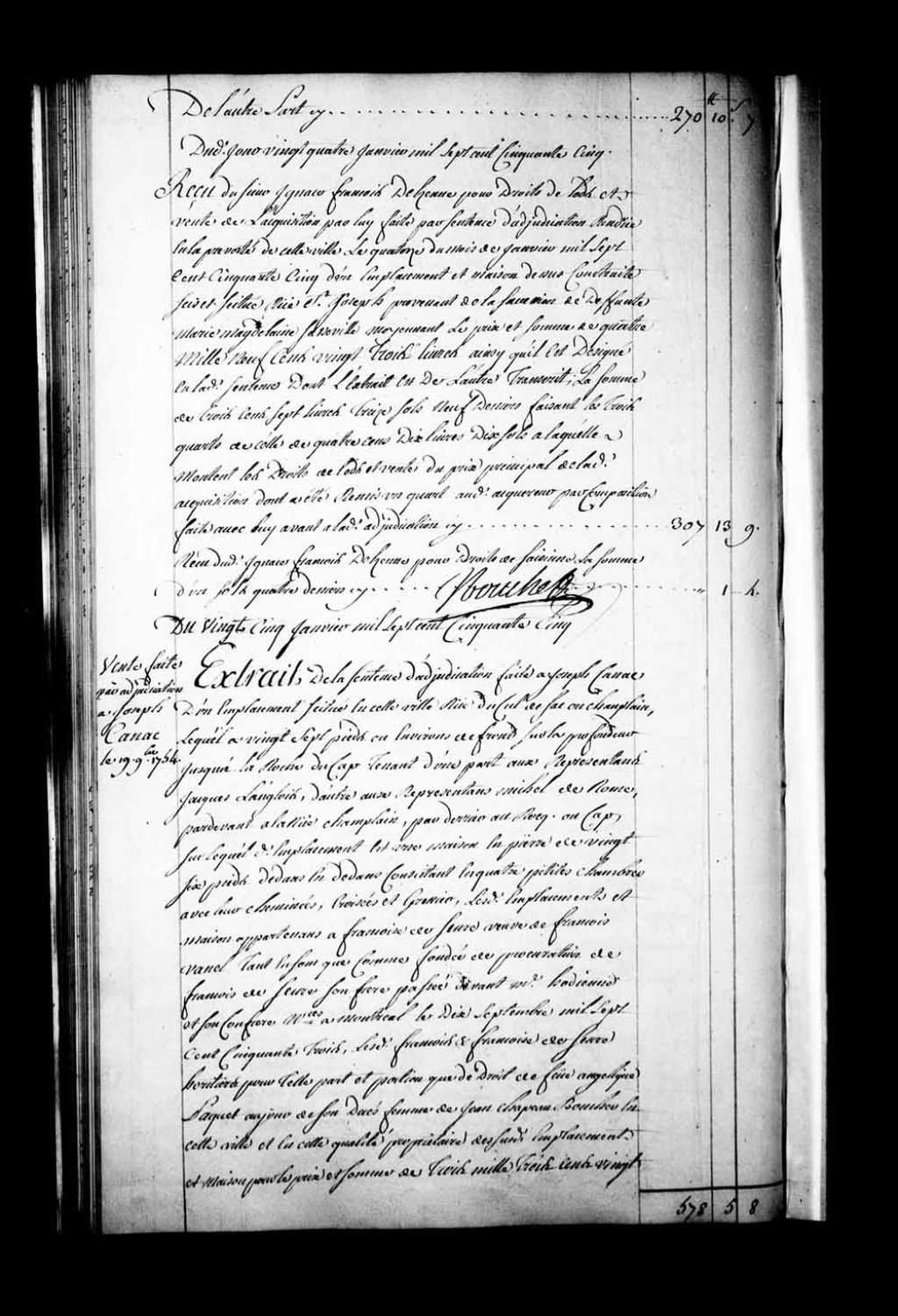 Extrait d'une sentence d'adjudication à Joseph Canac d'un emplacement et d'une maison de pierre sis rue du Cul-de-sac ou Champlain à Québec, appartenant auparavant à Françoise de Sevre (Desèvre), veuve de feu François Vanel (Vaussel, Vocelle), tant en son nom que comme fondée de procuration de François de Sevre (Desèvre), son frère, héritiers d'Angélique Paquet, femme de Jean Chapeau, boucher de Québec, et en cette qualité propriétaires desdits emplacements et maison