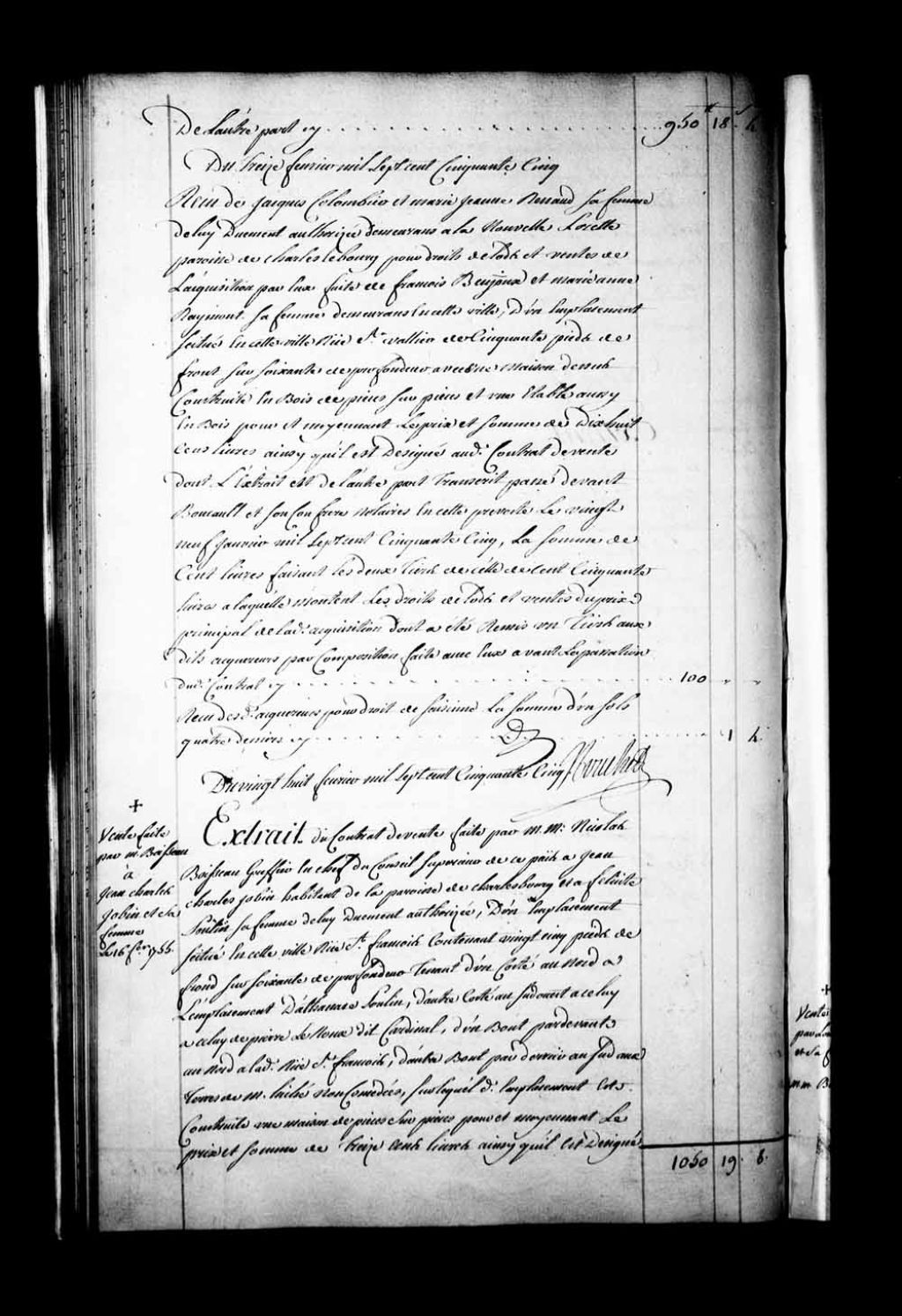 Extrait du contrat de vente par Maître Nicolas Boisseau, greffier en chef du Conseil supérieur de la Nouvelle-France, à Jean-Charles Jobin, habitant de la paroisse de Charlesbourg, et Félicité Poulin, sa femme, d'un emplacement et d'une maison de pièce sur pièce sis rue Saint-François à Québec (Notaires Jean-Antoine Saillant de Collégien et Jean-Claude Panet), 16 février 1755, Archives nationales à Québec, Fonds Intendants, (03Q,E1,S4,SS4,D200,P1).