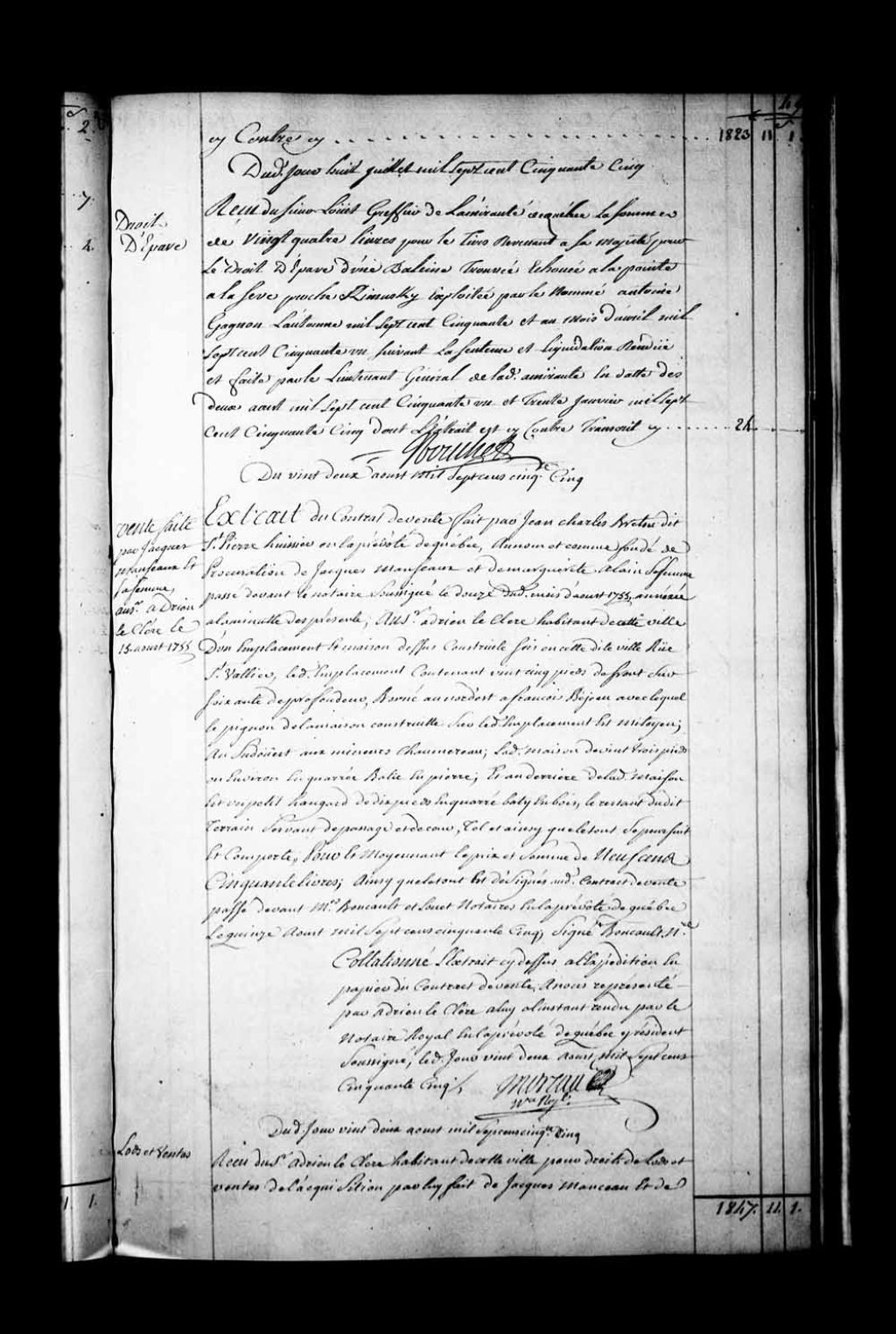 Extrait du contrat de vente par Jean-Charles Breton dit Saint-Pierre, huissier en la Prévôté de Québec, au nom et comme fondé de procuration de Jacques Manseaux (Manseau) et Marguerite Alain, sa femme, au Sieur Adrien LeClere (Leclerc), habitant de Québec, d'un emplacement, d'une maison de pierre et d'un petit hangar en bois sis rue Saint-Vallier à Québec (Notaires Gilbert Boucault de Godefus et Claude Louet)