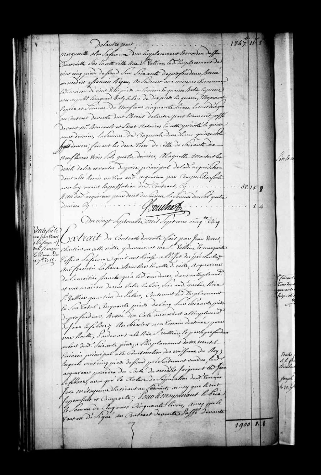 Extrait du contrat de vente par Jean Verret, charretier demeurant rue Saint-Vallier à Québec, et Marguerite Tessier, sa femme, au Sieur François LaRaux (Lareau), boucher de Québec, de la moitié franche d'un emplacement et d'une maison de bois sis rue Saint-Vallier au quartier du Palais de Québec (Notaires Claude Barolet et Jean-Claude Panet), 15 septembre 1755, Archives nationales à Québec, Fonds Intendants, (03Q,E1,S4,SS4,D210,P1).