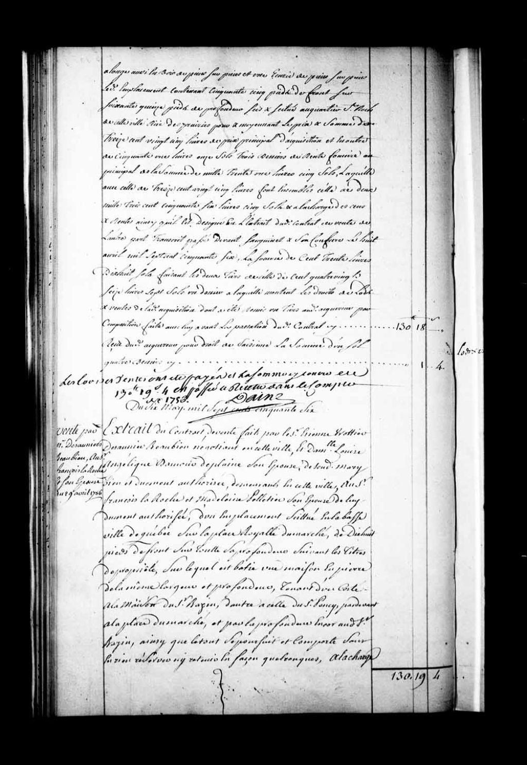 Extrait du contrat de vente par le Sieur Étienne Trottier Desaunier (Desaulniers) Beaubien, négociant de Québec, et Damoiselle Louise-Angélique Damour (Damours) de Plaine (DesPlaines), son épouse, demeurant à Québec, à François LaRoche et Madeleine Pelletier, son épouse, d'un emplacement et d'une maison de pierre sis sur la place Royale du Marché en la Basse-Ville de Québec (Notaires Jean-Baptiste Decharnay et Claude Louet)