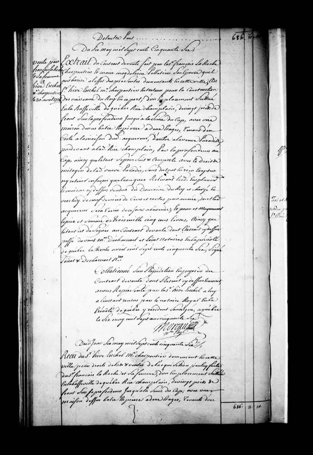 Extrait du contrat de vente par le Sieur François LaRoche, charpentier, et Marie-Madeleine Pelletier, son épouse, demeurant à Québec, au Sieur Yves Esechel (Ezequel, Ezeguiel, Ezequiel), maître charpentier entretenu pour la construction des vaisseaux du Roi au port de Québec, d'un emplacement et d'une maison de pierre sis rue Champlain en la Basse-Ville de Québec (Notaires Jean-Baptiste Decharnay et Claude Louet)
