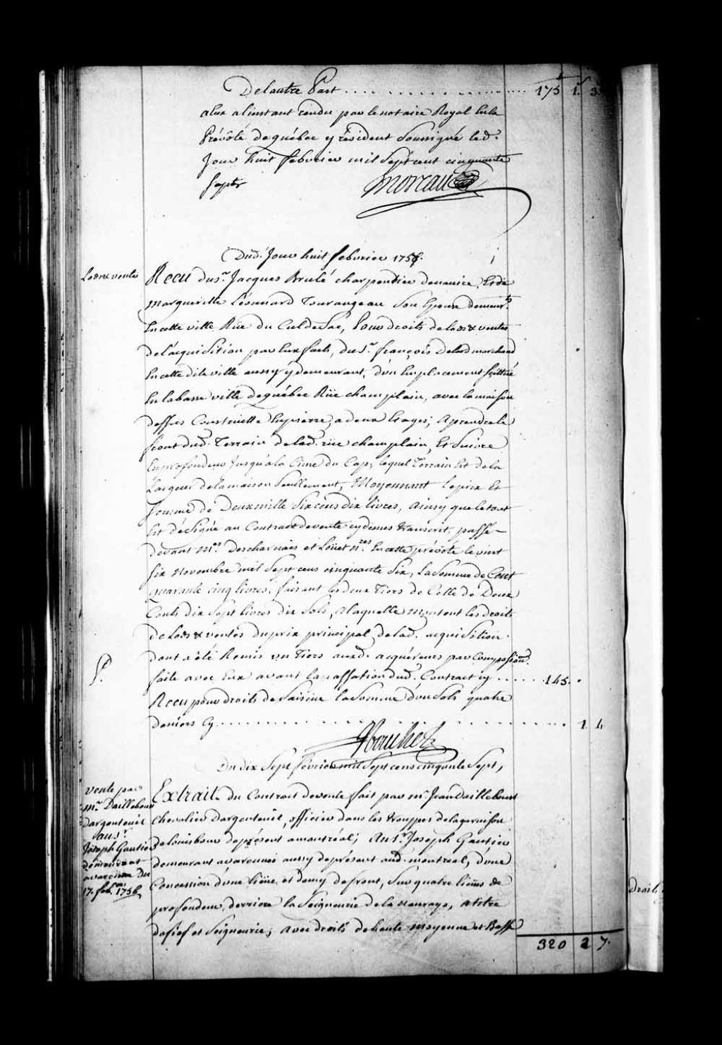 Extrait du contrat de vente par Monsieur Jean Dailleboust (d'Ailleboust), Chevalier d'Argenteuil, officier dans les troupes de la garnison de Louisbourg, au Sieur Joseph Gautier (Gauthier), demeurant à Varennes, d'une concession derrière la seigneurie de Lanoraie, à titre de fief et seigneurie avec les droits en relevant, ladite concession comportant en outre une maison et une écurie en bois (Notaires Louis-Claude Danré de Blanzy et Jean-Claude Panet), 17 février 1756, Archives nationales à Québec, Fonds Intendants, (03Q,E1,S4,SS4,D229,P1).