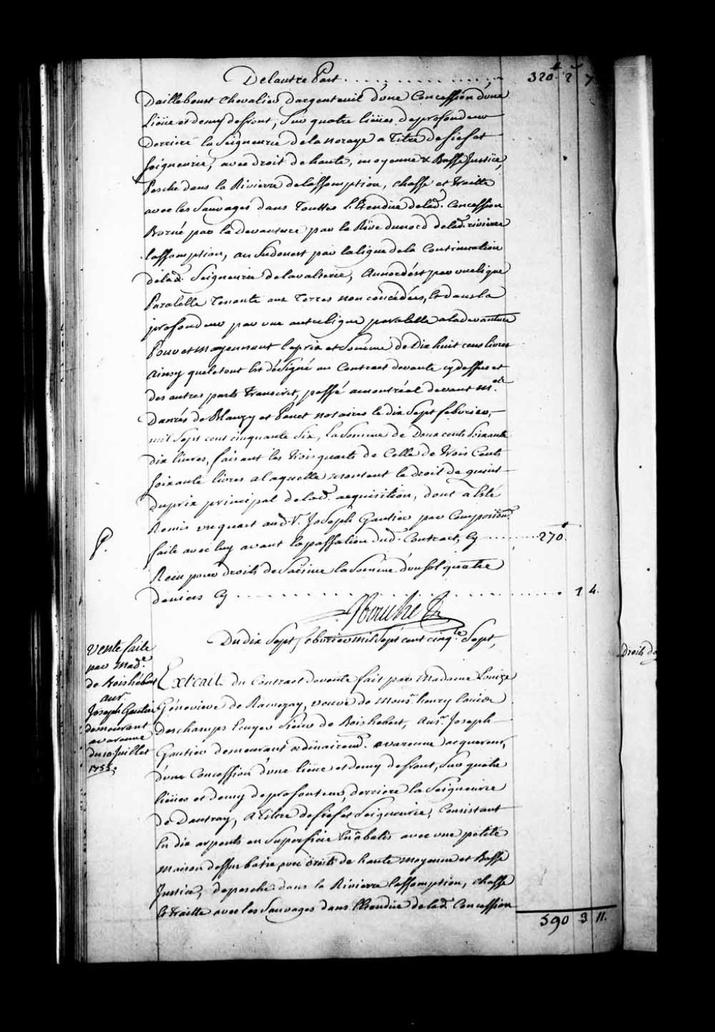 Extrait du contrat de vente par Madame Louise-Geneviève de Ramezay, veuve de feu Monsieur Henri-Louis Deschamps, écuyer, Sieur de Boishebert, au Sieur Joseph Gautier (Gauthier), demeurant à Varennes, d'une concession derrière la seigneurie de Dautré, à titre de fief et seigneurie avec les droits en relevant, ladite concession comportant en outre une petite maison (Notaires Louis-Claude Danré de Blanzy et Jean-Claude Panet), 10 juillet 1755, Archives nationales à Québec, Fonds Intendants, (03Q,E1,S4,SS4,D230,P1).