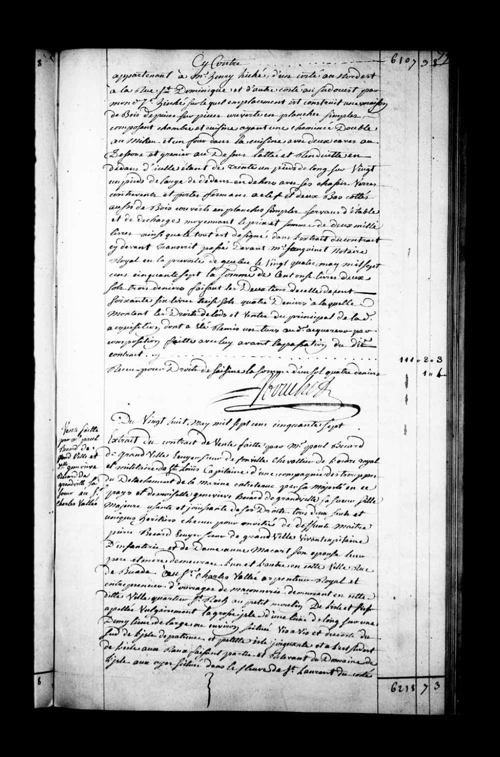 Extrait du contrat de vente par Monsieur Paul Becard de Grandville (Granville), écuyer, Sieur de Jonville, Chevalier de l'Ordre royal et militaire de Saint-Louis, capitaine d'une compagnie des troupes du détachement de la Marine entretenues par Sa Majesté en Nouvelle-France, et Damoiselle Geneviève Becard de Grandville, sa soeur, fille majeure, uniques héritiers pour chacun la moitié de feu Maître Pierre Becard, écuyer, Sieur de Grandville, de son vivant capitaine d'infanterie, et de Dame Anne Macart (Macard), son épouse, leur père et mère, demeurant l'un et l'autre rue Buade, au Sieur Charles Vallée, arpenteur royal et entrepreneur d'ouvrages de maçonnerie demeurant au petit moulin du quartier Saint-Roch de Québec, de l'île et fief appelée vulgairement la Grosse Île, située vis-à-vis et du côté sud de l'île de Patience et à l'est-sud-est de l'île aux Ruaux (île Ruau), faisant partie et relevant du domaine de l'île aux Oies située dans le fleuve Saint-Laurent, avec les droits en relevant (Notaire Jean-Antoine Saillant de Collégien)