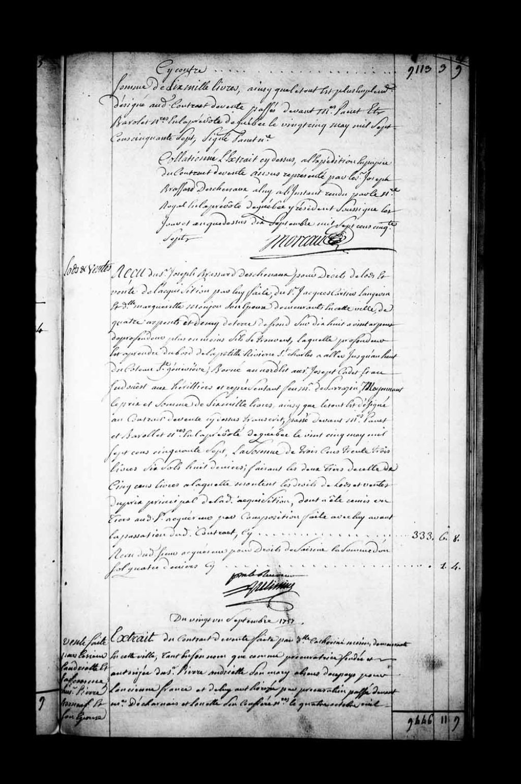 Extrait du contrat de vente par Damoiselle Catherine Morin, demeurant à Québec, tant en son nom que comme procuratrice du Sieur Pierre Andriette, son mari, absent de la Nouvelle-France, au Sieur Pierre Borneuf, négociant, et Madeleine Dégrés (Degré, Degrais), son épouse, demeurant rue Buade à Québec, d'un emplacement et d'une maison de pierre sise rue de l'Escalier en la Basse-Ville de Québec (Notaires Claude Barolet et Jean-Claude Panet)