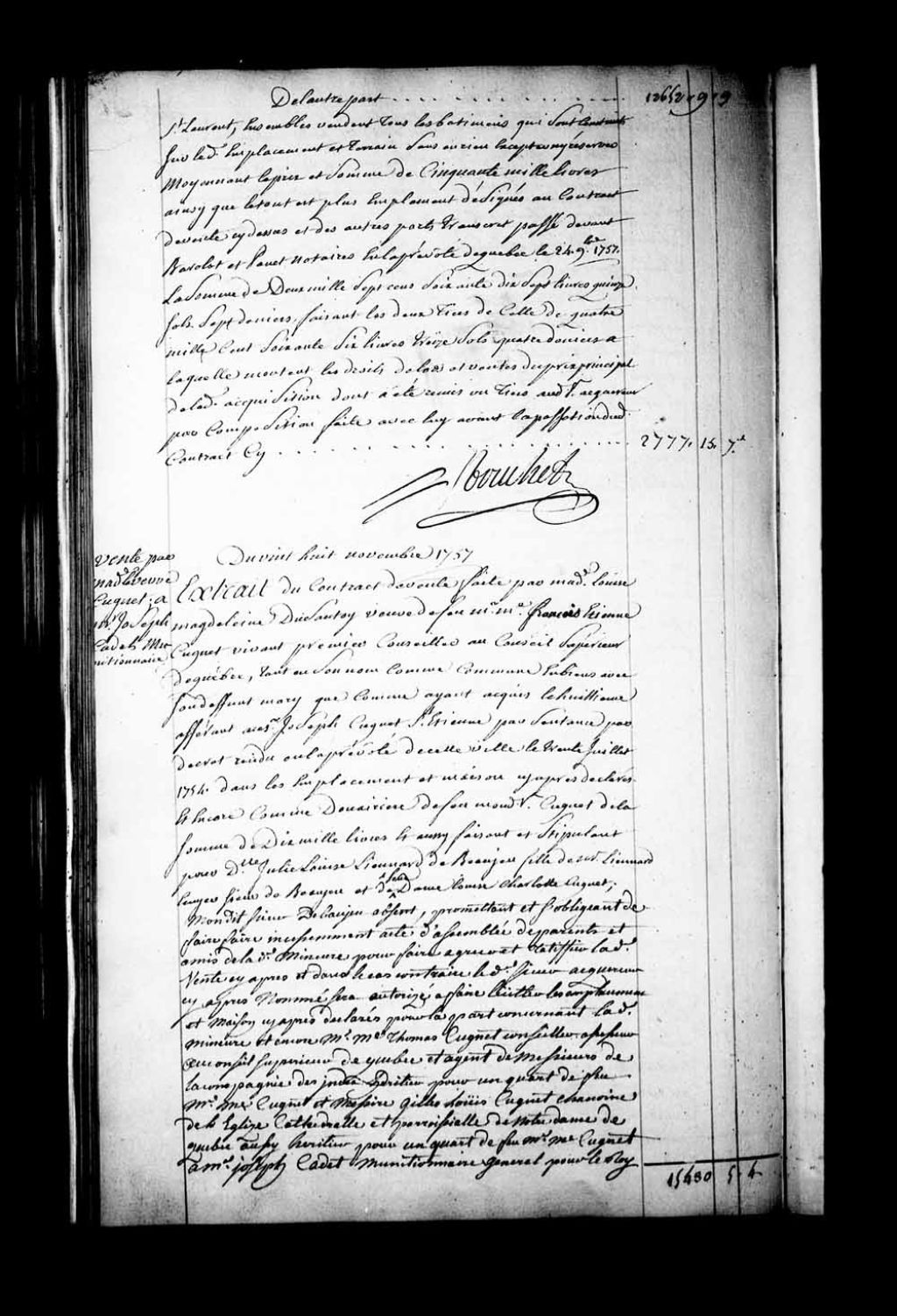 Extrait du contrat de vente par Damoiselle Louise-Madeleine Dusautoy, veuve de feu Maître François-Étienne Cugnet, de son vivant premier Conseiller au Conseil supérieur de Québec, tant en son nom comme ayant été commune en biens avec son défunt mari que comme douairière dudit feu Cugnet, aussi faisant et stipulant pour Damoiselle Julie-Louise Liennard (Liénard) de Beaujeu, fille de Monsieur Liennard, écuyer, Sieur de Beaujeu, et de feue Dame Louise-Charlotte Cugnet, ladite vente étant aussi faite par Maître Thomas Cugnet, Conseiller assesseur au Conseil supérieur de Québec et agent des Messieurs de la Compagnie des Indes, et par Messire Gilles-Louis Cugnet, chanoine de l'église cathédrale et paroissiale de Notre-Dame de Québec, tous héritiers pour un quart dudit feu Maître Cugnet, à Monsieur Joseph Cadet, munitionnaire général pour le Roi en toute la Nouvelle-France, d'un emplacement, d'une maison de pierre et des hangars sis rue Saint-Pierre en la Basse-Ville de Québec (Notaires Jean-Claude Panet et Claude Barolet), 28 novembre 1757, Archives nationales à Québec, Fonds Intendants, (03Q,E1,S4,SS4,D260,P1).