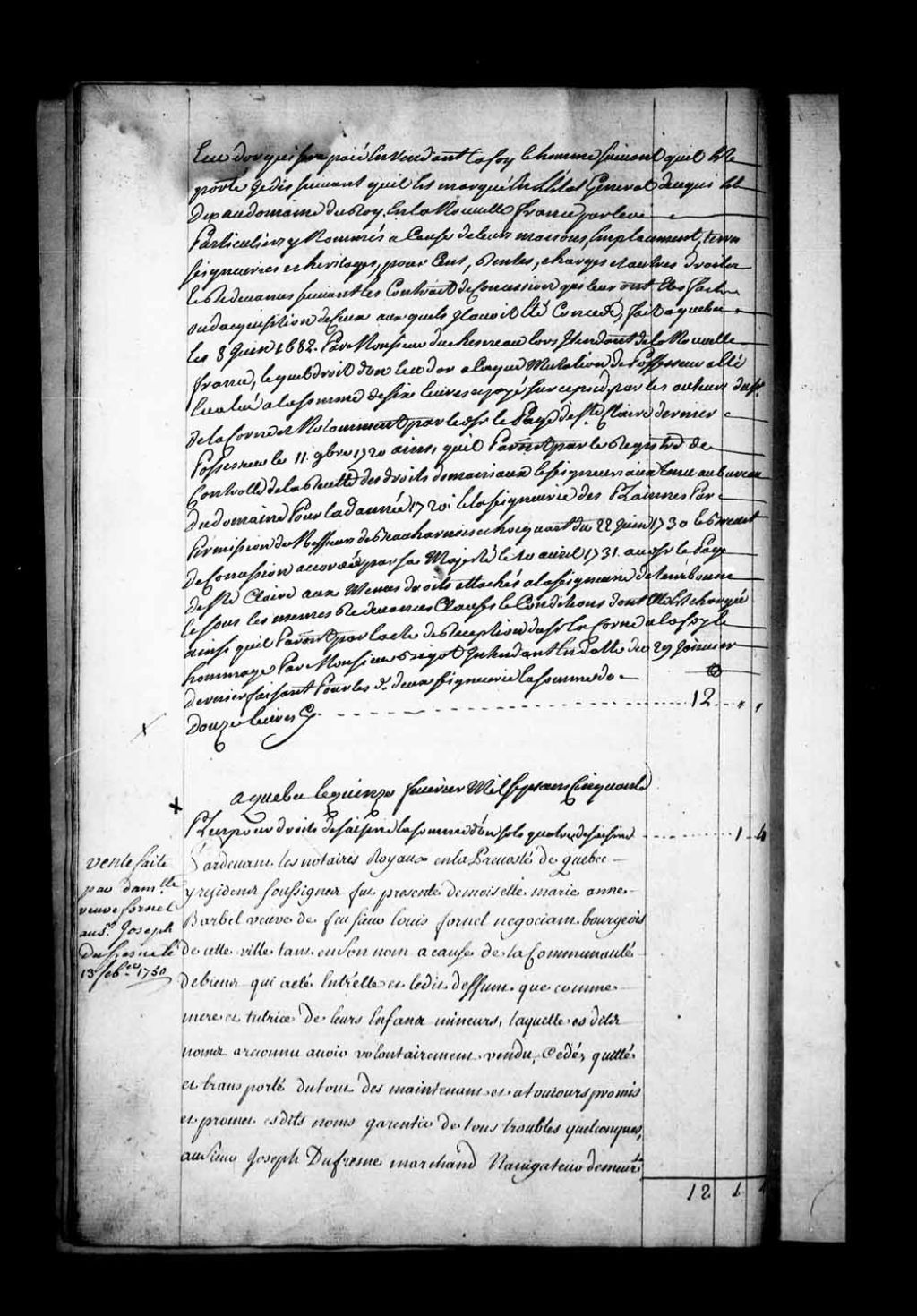 Contrat de vente par Damoiselle Marie-Anne Barbel, demeurant place Royale à Québec, veuve du feu Sieur Louis Fornel, négociant bourgeois de Québec, tant en son nom à cause de la communauté de biens qui a été entre elle et ledit défunt que comme mère et tutrice de leurs enfants mineurs, au Sieur Joseph Dufresne, marchand navigateur de Québec, d'un emplacement et d'une maison de pierre sis rue du Sault-au-Matelot en la Basse-Ville de Québec (Notaires Christophe-Hilarion Dulaurent et Simon Sanguinet père), 13 février 1750, Archives nationales à Québec, Fonds Intendants, (03Q,E1,S4,SS4,D2,P1).
