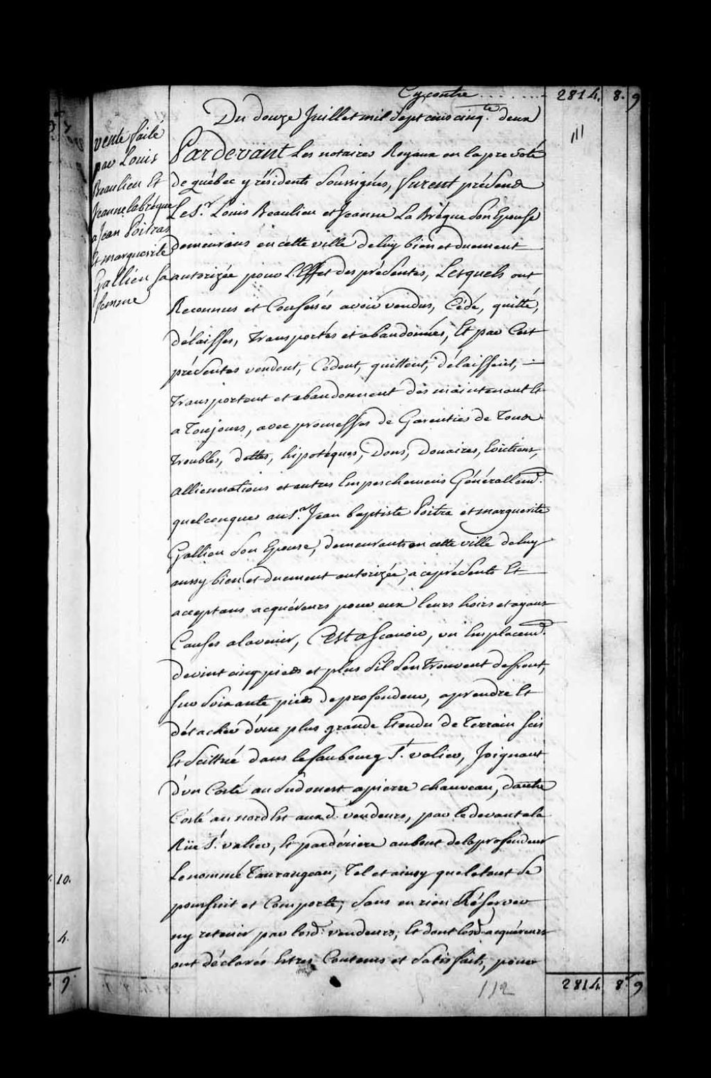 Contrat de vente par le Sieur Louis Beaulieu et Jeanne LaBrèque (Labrecque), son épouse, demeurant rue Saint-Vallier à Québec, au Sieur Jean-Baptiste Poitra (Poitras) et Marguerite Gallien (Gacien; Gatien), son épouse, demeurant à Québec, d'un emplacement sis rue Saint-Vallier au faubourg Saint-Vallier de Québec (Notaires Claude Louet et Christophe-Hilarion Dulaurent)