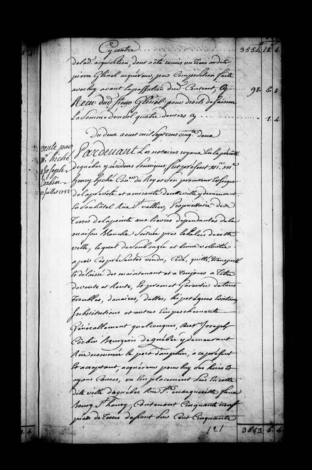 Contrat de vente par Maître Henri Hiché, Conseiller du Roi et Son Procureur au siège de la Prévôté et de l'Amirauté de Québec, demeurant rue Saint-Vallier à Québec, propriétaire des terres de la Pointe aux Lièvres, dépendantes de la Maison Blanche située près du Palais de Québec, au Sieur Joseph Corbin, bourgeois demeurant rue du Port-Dauphin, d'un emplacement sis rue Sainte-Marguerite au faubourg Saint-Henri de Québec (Notaires Paul-Antoine-François Lanouiller Desgranges et Simon Sanguinet père)