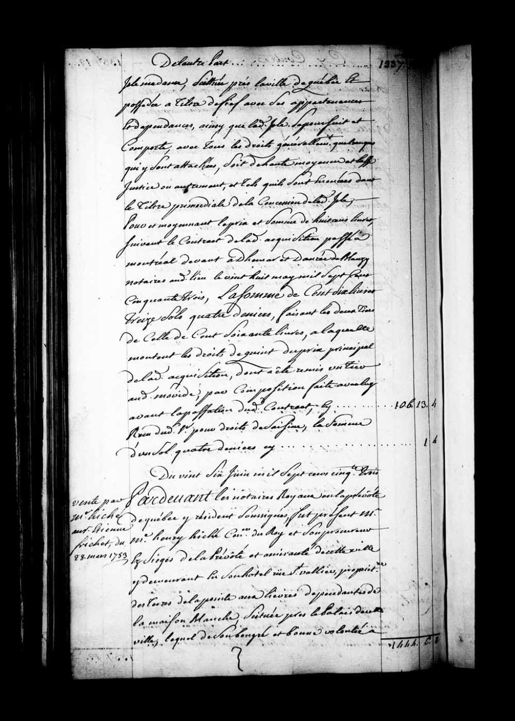 Contrat de vente par Maître Henri Hiché, Conseiller du Roi et Son procureur au siège de la Prévôté et de l'Amirauté de Québec, demeurant rue Saint-Vallier à Québec, propriétaire des terres de la Pointe aux Lièvres, dépendantes de la Maison Blanche située près du Palais de Québec, au Sieur Étienne Frichet (Fréchet; Fréchette), demeurant rue Saint-Pierre à Québec, d'un emplacement sis rue Saint-Pierre au faubourg Saint-Henri de Québec (Notaires Paul-Antoine-François Lanouiller Desgranges et Jean-Antoine Saillant de Collégien)