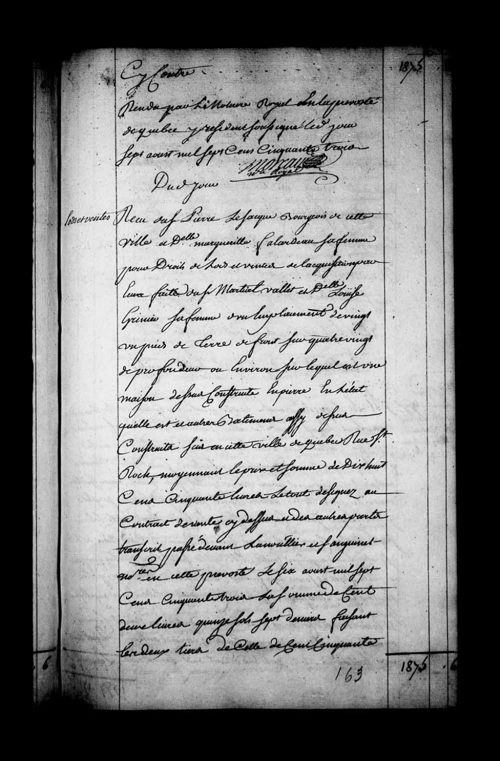 Reçu pour le paiement des droits de lots et ventes et des droits de saisine par le Sieur Pierre Lesacque, bourgeois de Québec, et Damoiselle Marguerite Falardeau, sa femme, 7 août 1753, Archives nationales à Québec, Fonds Intendants, (03Q,E1,S4,SS4,D63,P2).