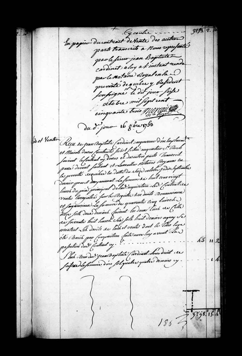 Contrat de vente par Maître Henri Hiché, Conseiller du Roi et Son procureur au siège de la Prévôté et de l'Amirauté de Québec, demeurant rue Saint-Vallier à Québec, propriétaire des terres de la Pointe aux Lièvres, dépendantes de la Maison Blanche près du Palais de Québec, à Ignace Cliche, habitant de la paroisse de Charlesbourg, d'un emplacement sis à Québec, borné au nord par la rue Saint-Jean (Notaires Paul-Antoine-François Lanouiller Desgranges et Simon Sanguinet père), 17 juin 1753, Archives nationales à Québec, Fonds Intendants, (03Q,E1,S4,SS4,D70,P1).