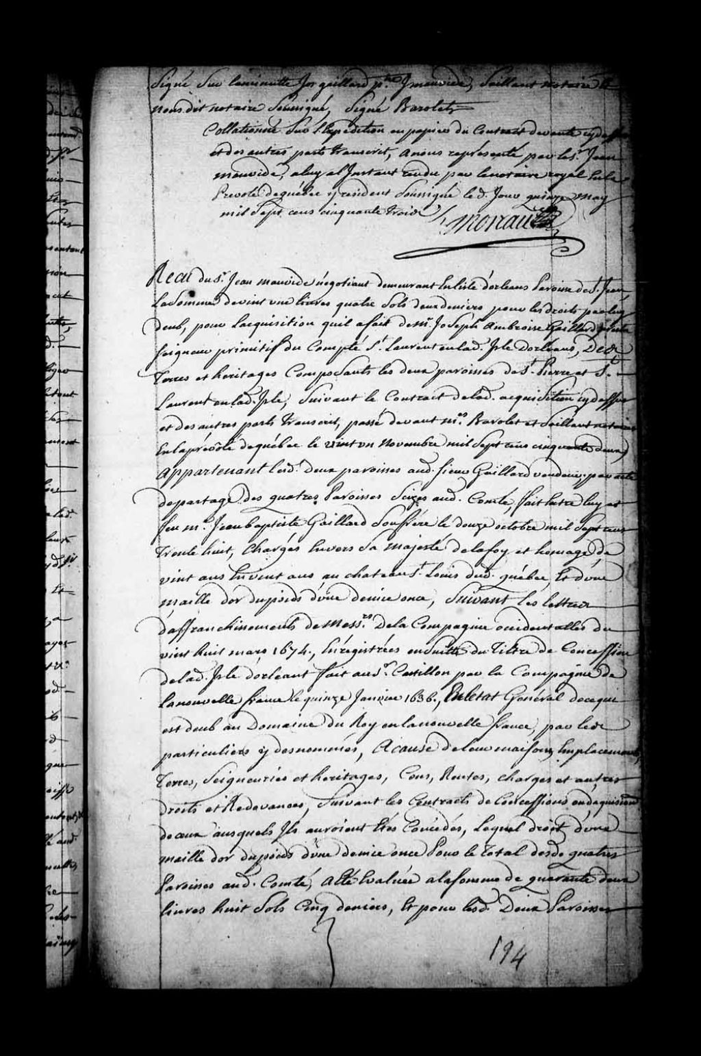 Reçu pour le paiement des droits d'acquisition, des charges seigneuriales et des droits de saisine par le Sieur Jean Mauvide, négociant demeurant en la paroisse Saint-Jean de l'île d'Orléans, 15 mai 1753, Archives nationales à Québec, Fonds Intendants, (03Q,E1,S4,SS4,D74,P2).