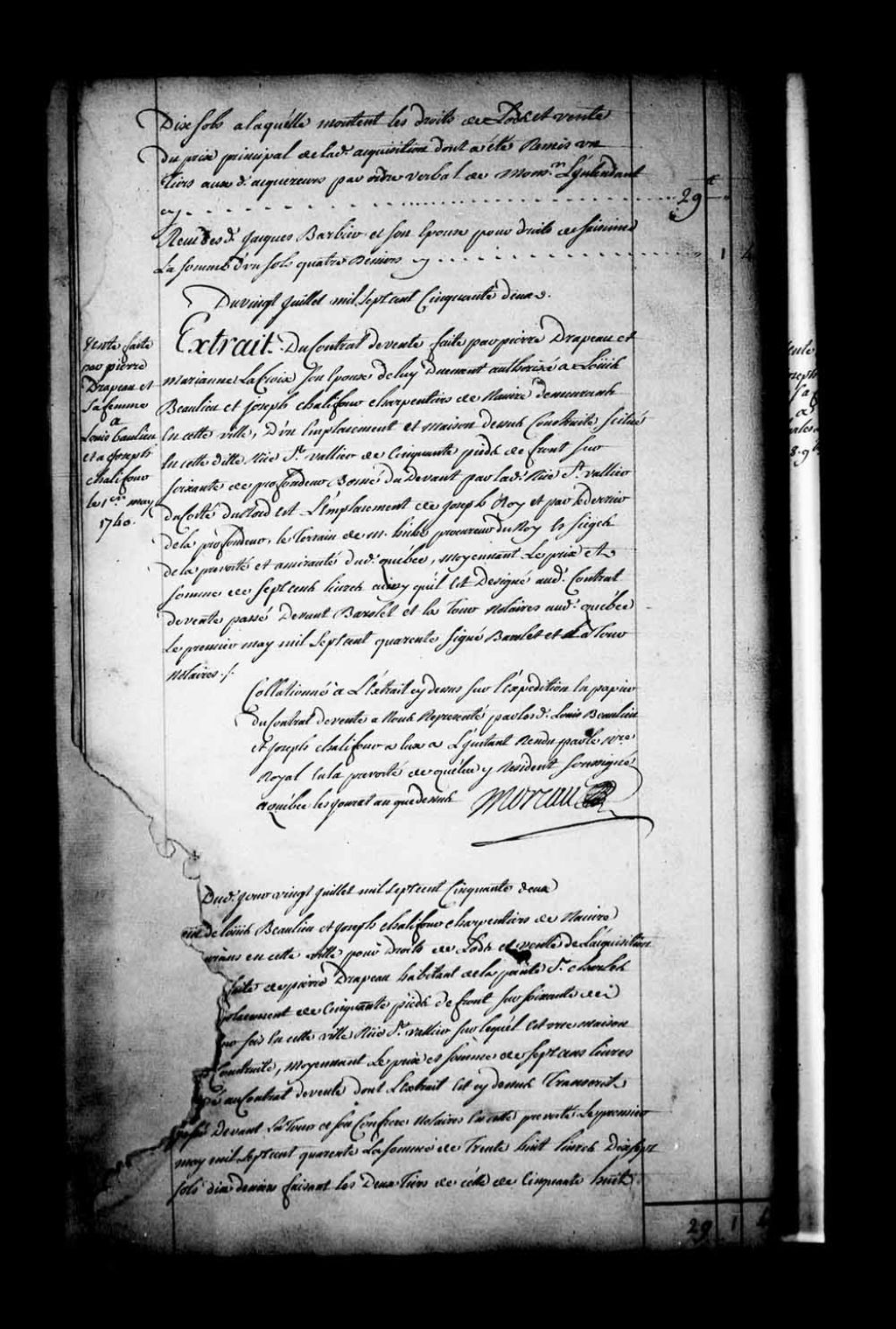 Extrait du contrat de vente par Pierre Drapeau et Marie-Anne LaCroix, son épouse, à Louis Beaulieu et Joseph Chalifour (Chalifou), charpentiers de navire demeurant à Québec, d'un emplacement et d'une maison sis rue Saint-Vallier à Québec (Notaires Jean de Latour et Claude Barolet)