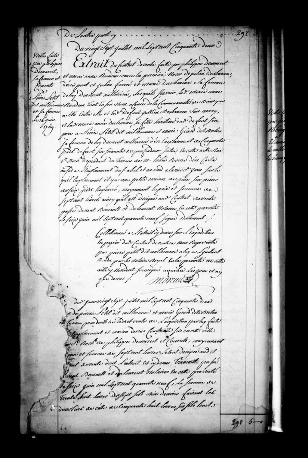 Extrait du contrat de vente par Philippe Demarest (Desmarais) et Marie-Anne Rondeau, veuve en premières noces de Julien Ducharme, à cause de la communauté de biens qui a été entre elle et ledit Julien Ducharme, d'une part, et par Julien Fourré et Marie-Anne Ducharme, son épouse, fille héritière dudit Julien Ducharme, son père, d'autre part, à Pierre Petit dit Milhomme et Marie Girard dit Breton, sa femme, d'un emplacement et d'une petite maison de pièce sur pièce sis rue Saint-Roch à Québec (Notaires Gilbert Boucault de Godefus et Christophe-Hilarion Dulaurent), 16 juin 1749, Archives nationales à Québec, Fonds Intendants, (03Q,E1,S4,SS4,D83,P1).