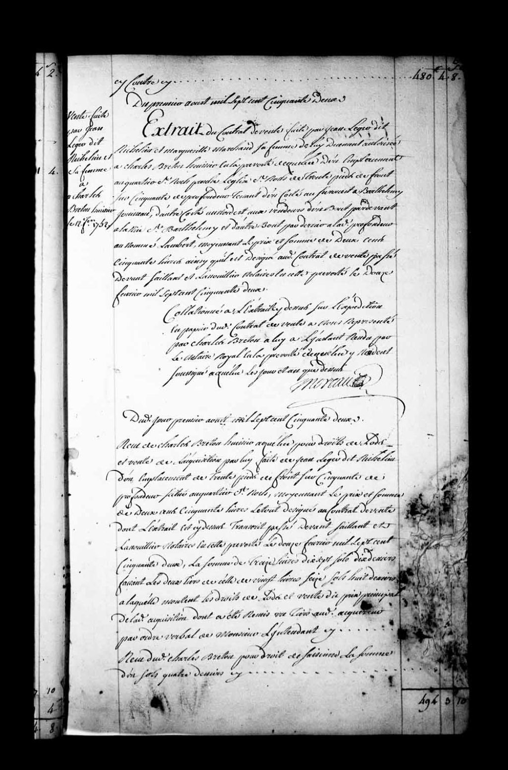 Extrait du contrat de vente par Jean Leger dit Richelieu et Marguerite Marchand, sa femme, à Charles Breton, huissier en la Prévôté de Québec, d'un emplacement sis au quartier Saint-Roch de Québec, près de l'église Saint-Roch (Notaires Jean-Antoine Saillant de Collégien et Paul-Antoine-François Lanouiller Desgranges), 12 février 1752, Archives nationales à Québec, Fonds Intendants, (03Q,E1,S4,SS4,D86,P1).