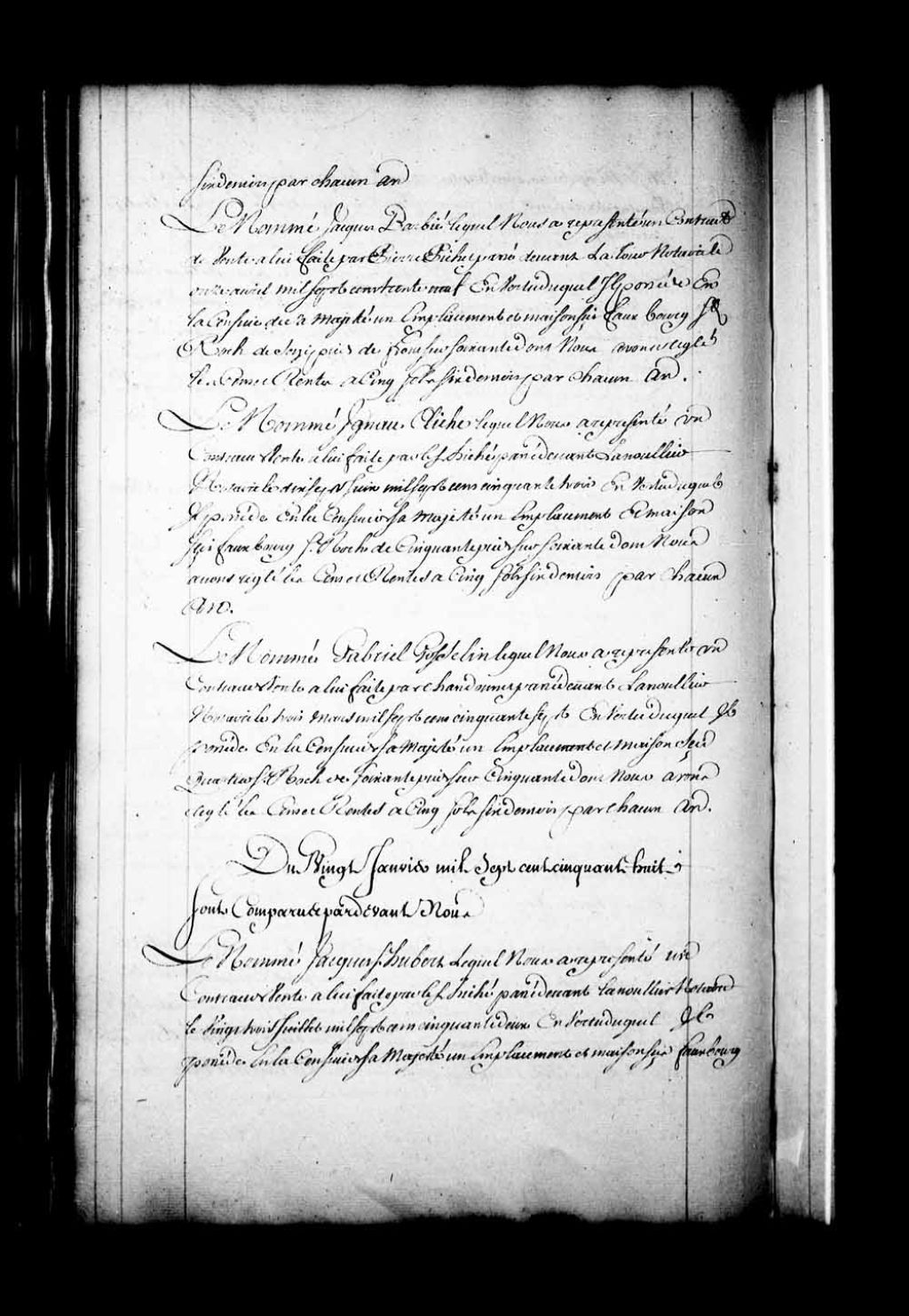 Déclaration du nommé Jacques Saint-Hubert quant à un emplacement et une maison sis au faubourg Saint-Roch de Québec, 20 janvier 1758, Archives nationales à Québec, Fonds Intendants, (03Q,E1,S4,SS4,P384).