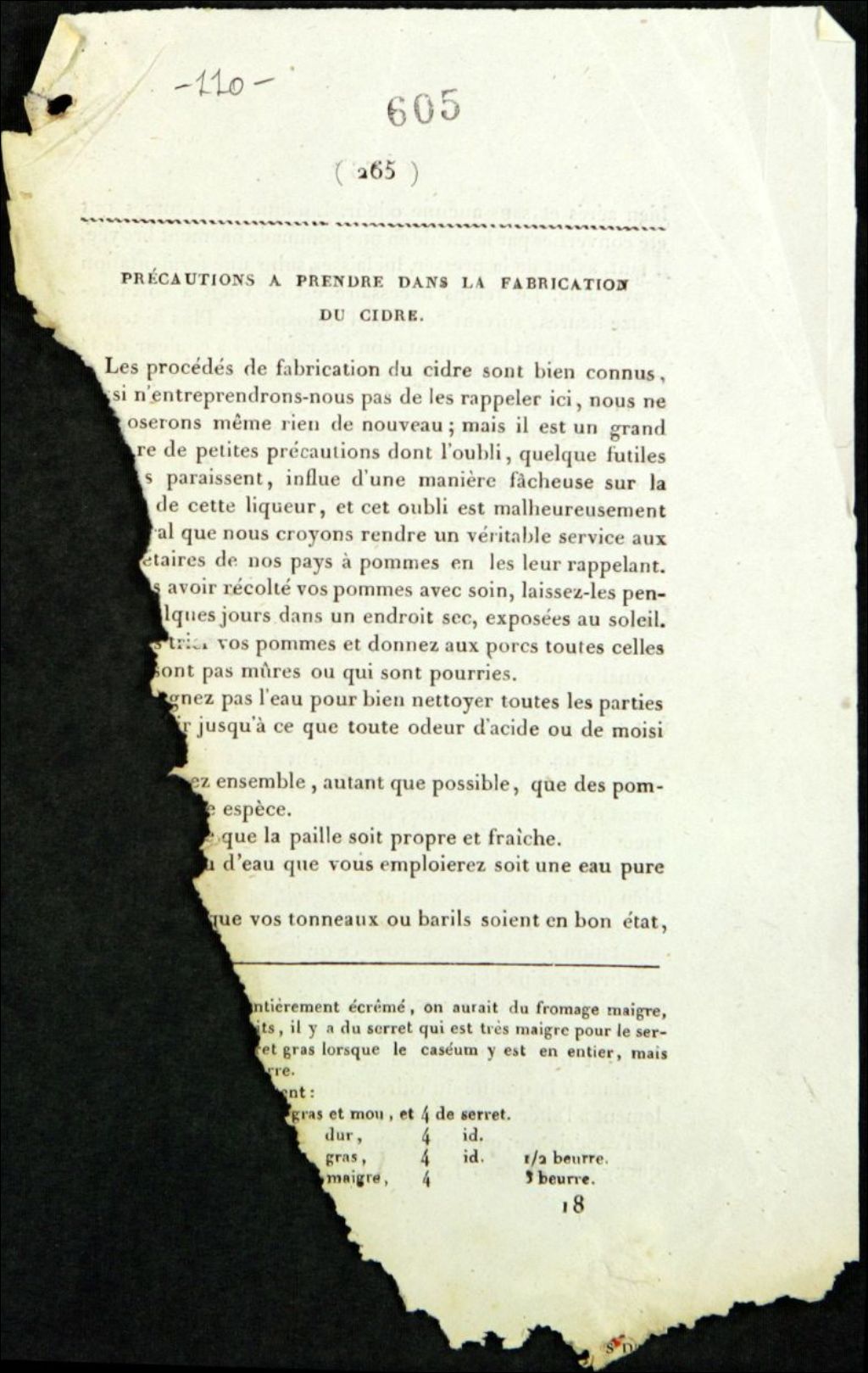 Article sur les précautions à prendre dans la fabrication du cidre, 1er janvier 1798 et 31 décembre 1921, Archives nationales à Québec, Fonds Famille Joly de Lotbinière, (03Q,P351,S2,P110).
