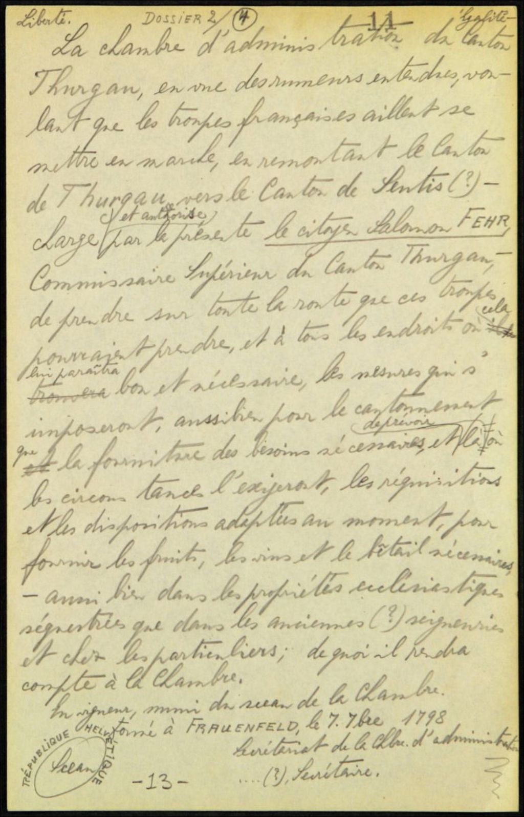 Ordre donné par la Chambre d'administration du canton de Thurgau [Suisse], sur de prétendues rumeurs de déplacement de troupe française, en remontant le canton de Thurgau vers le canton de Senlis, 7 septembre 1798, Archives nationales à Québec, Fonds Famille Joly de Lotbinière, (03Q,P351,S2,P13).