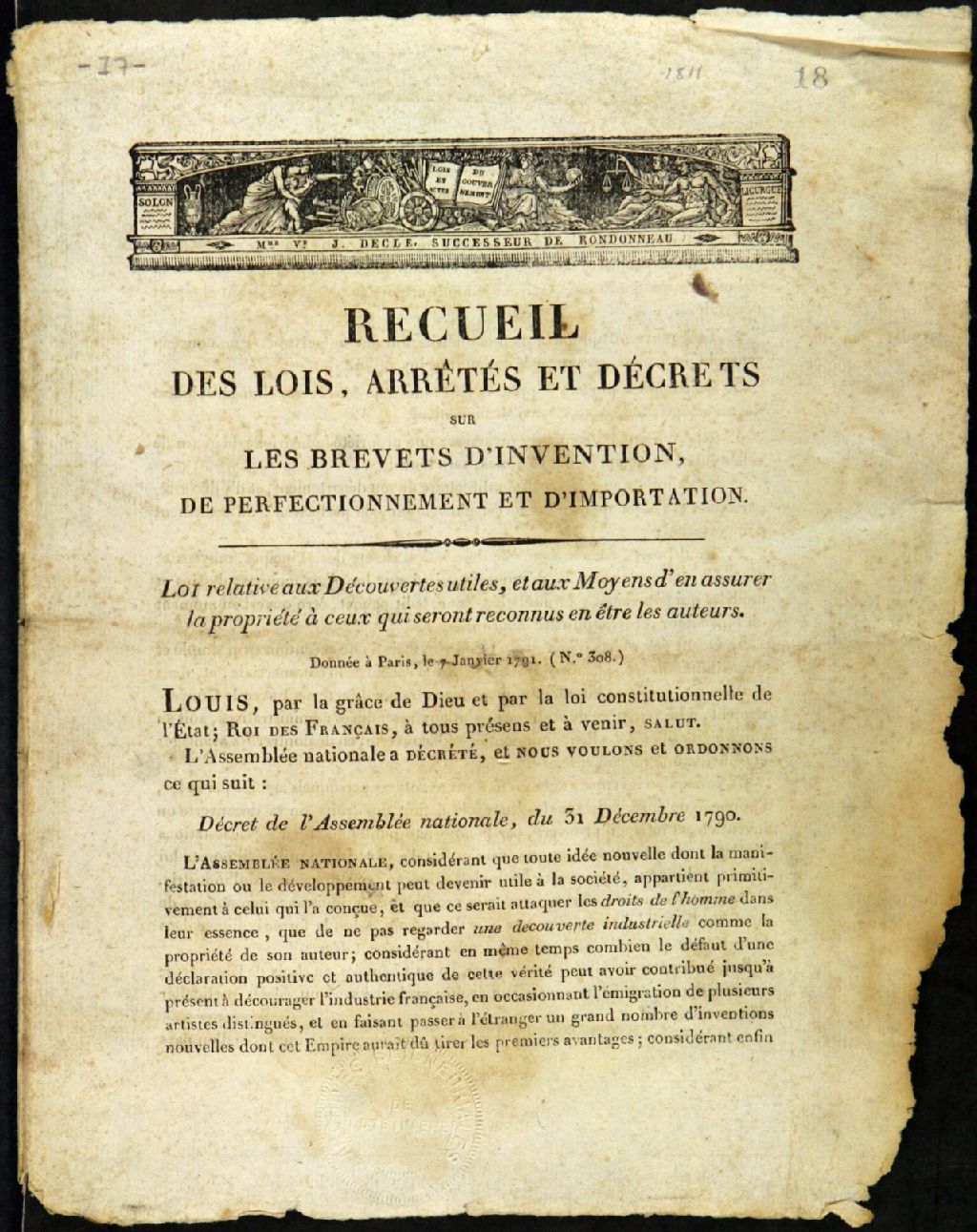Recueil des Lois, arrêtés et Décrets sur les brevets d'invention, de perfectionnement et d'importation : Loi relative aux découvertes utiles, et aux moyens d'en assurer la propriété à ceux qui seront reconnus en être les auteurs (donnée à Paris, le 7 janvier 1791, N 308)