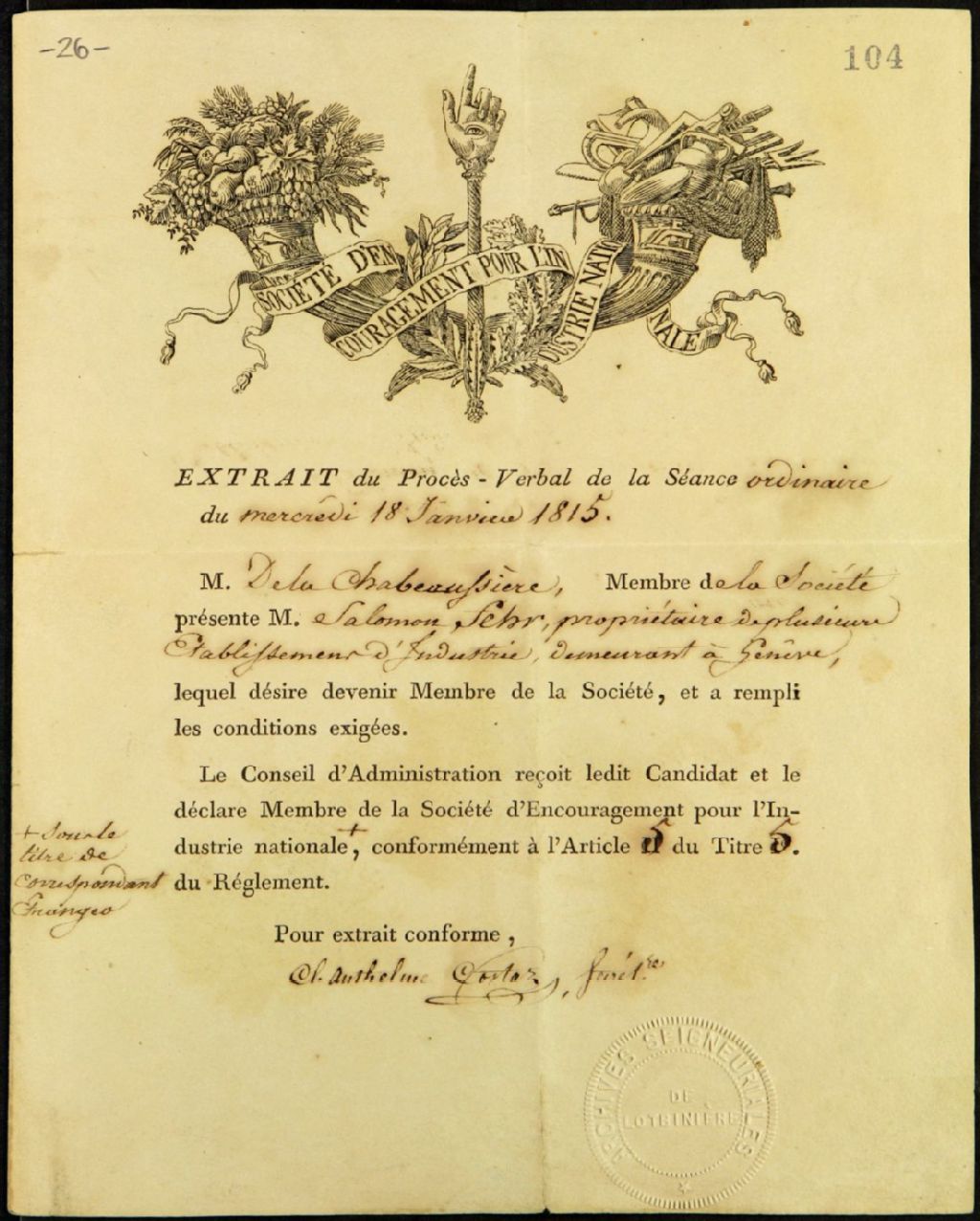 Société d'encouragement pour l'industrie nationale, 18 janvier 1815, Archives nationales à Québec, Fonds Famille Joly de Lotbinière, (03Q,P351,S2,P26).
