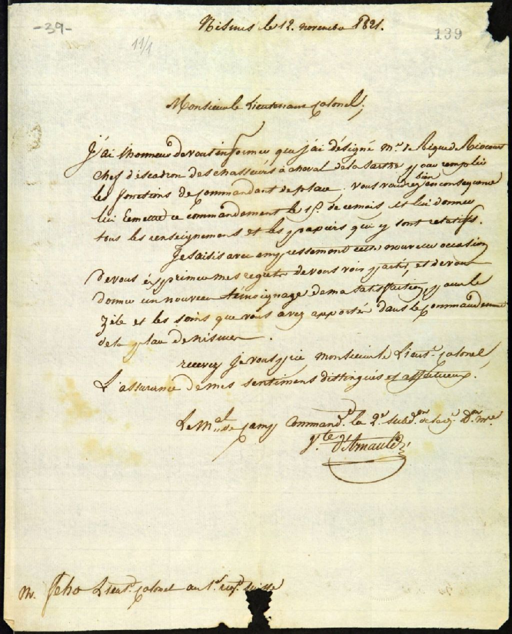 Lettre du vicomte d'Arnauld, commandant de la 2e subdivision, à [Salomon] Fehr, 12 novembre 1821, Archives nationales à Québec, Fonds Famille Joly de Lotbinière, (03Q,P351,S2,P39).