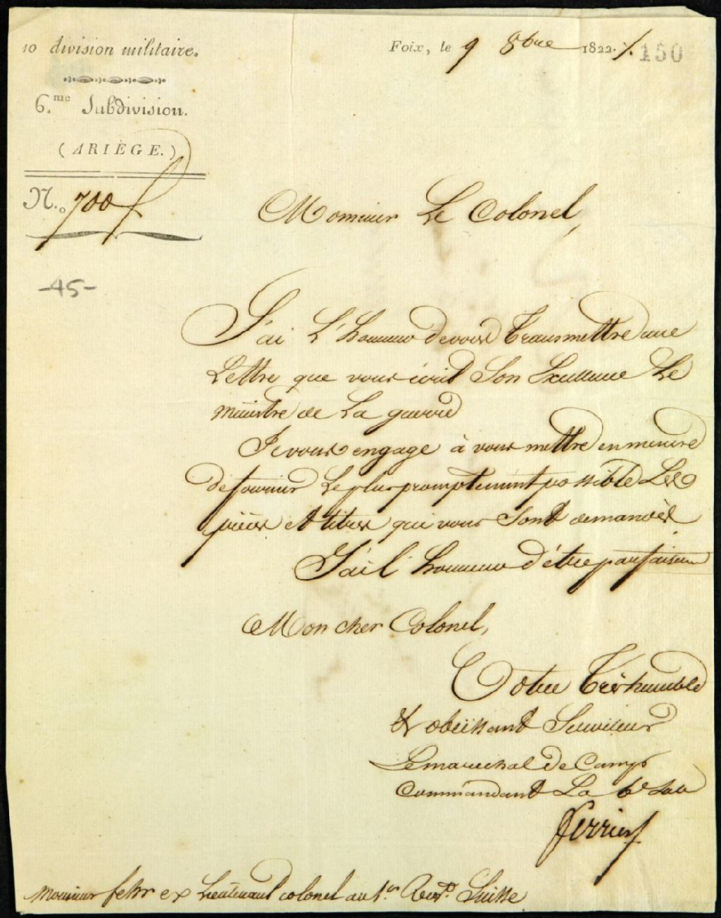 10 Division militaire, 6e subdivision, Ariège. N° 700. Lettre du maréchal [Perrief ?], à Salomon Fehr, 8 octobre 1822, Archives nationales à Québec, Fonds Famille Joly de Lotbinière, (03Q,P351,S2,P45).